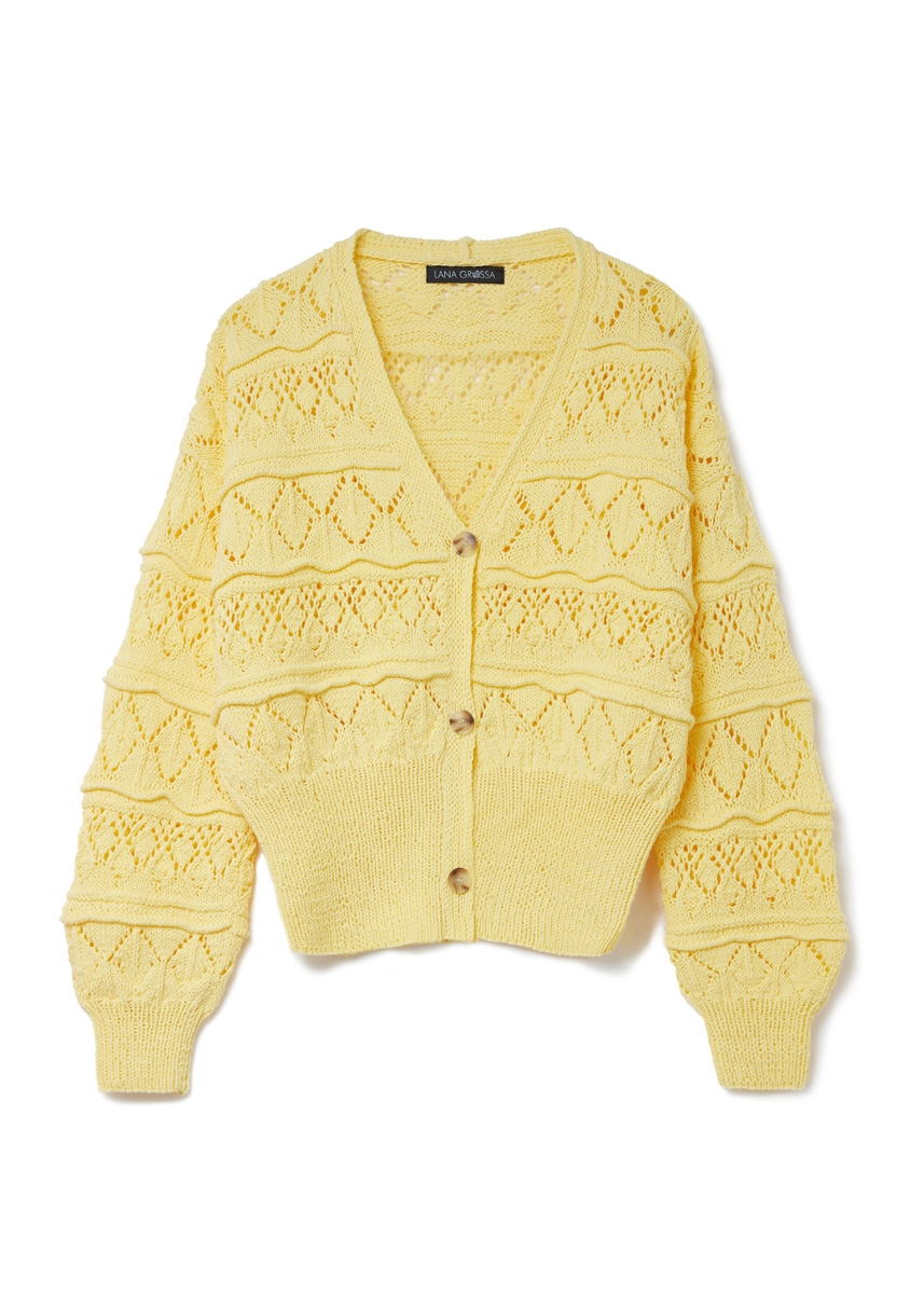 Lana Grossa Elastico (96% Baumwolle, 4% Polyester (Elité), Lauflänge 160 m/50 g), 500 (550 – 600) g Gelb (Fb. 41); Stricknadeln Nr. 3 und 3,5, sowie 3 Knöpfe von UNION KNOPF, Art. 452260, Fb Braunbeige, Ø 20 mm.