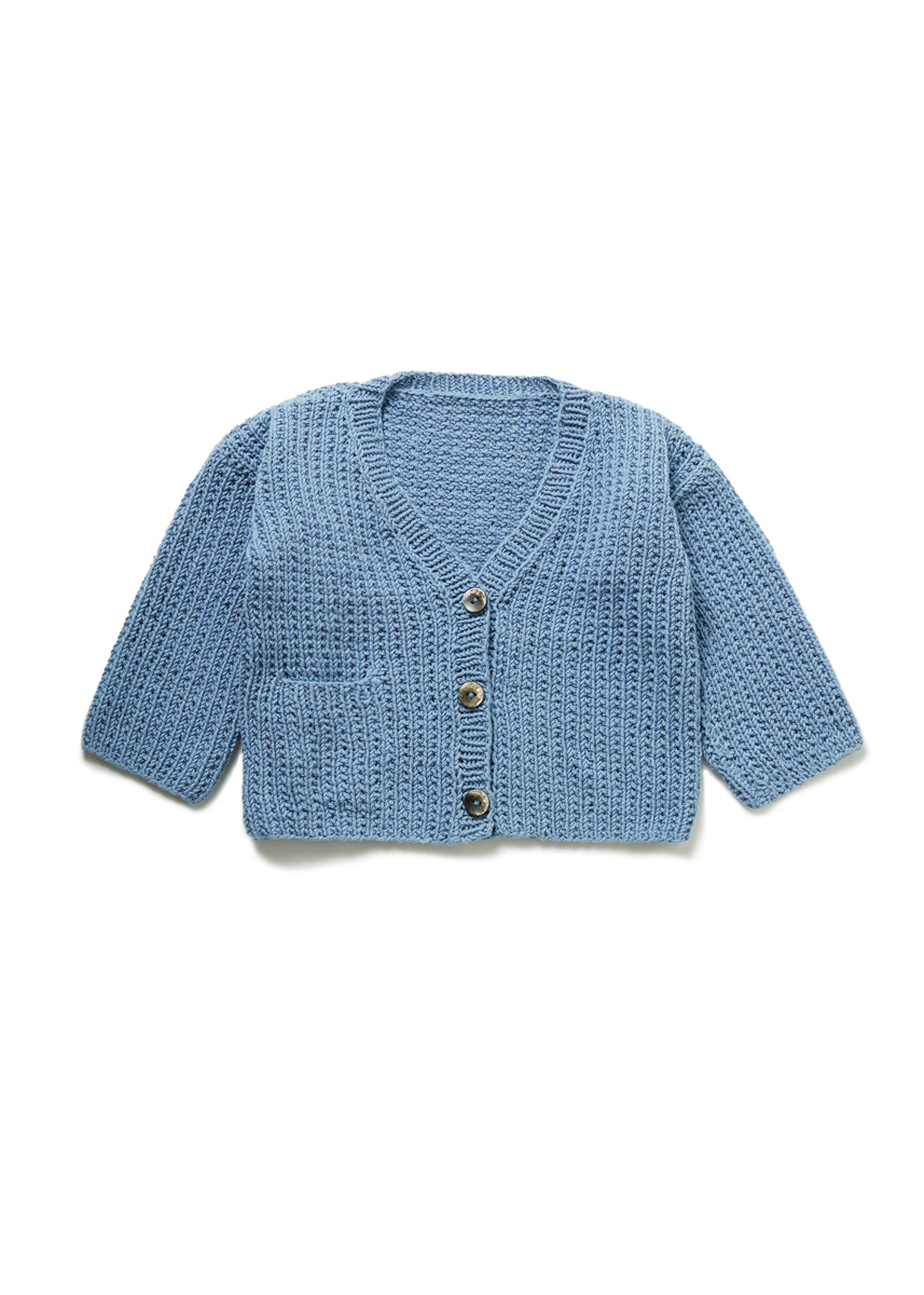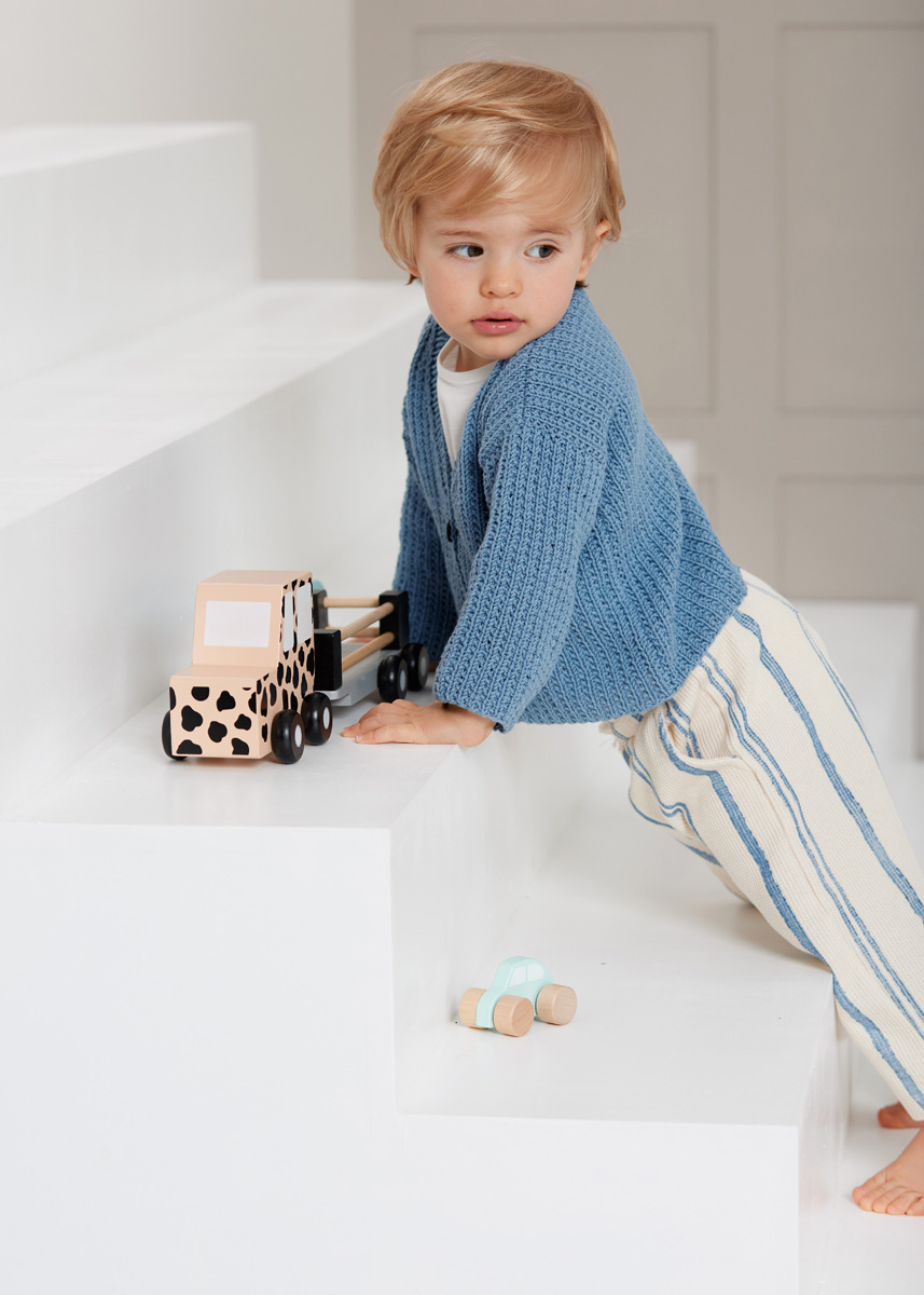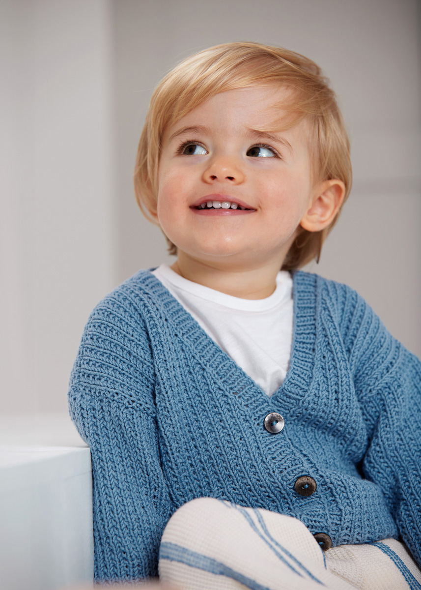 Lana Grossa-Qualität „Elastico“ (96 % Baumwolle, 4 % Polyester (Elité); Lauflänge = 160 m/50 g): 100 (150/150/200) g Rauchblau (Fb 142); je eine Rundstricknadel 3,5 mm und 4 mm; 3 Knöpfe mit 15 mm Ø.