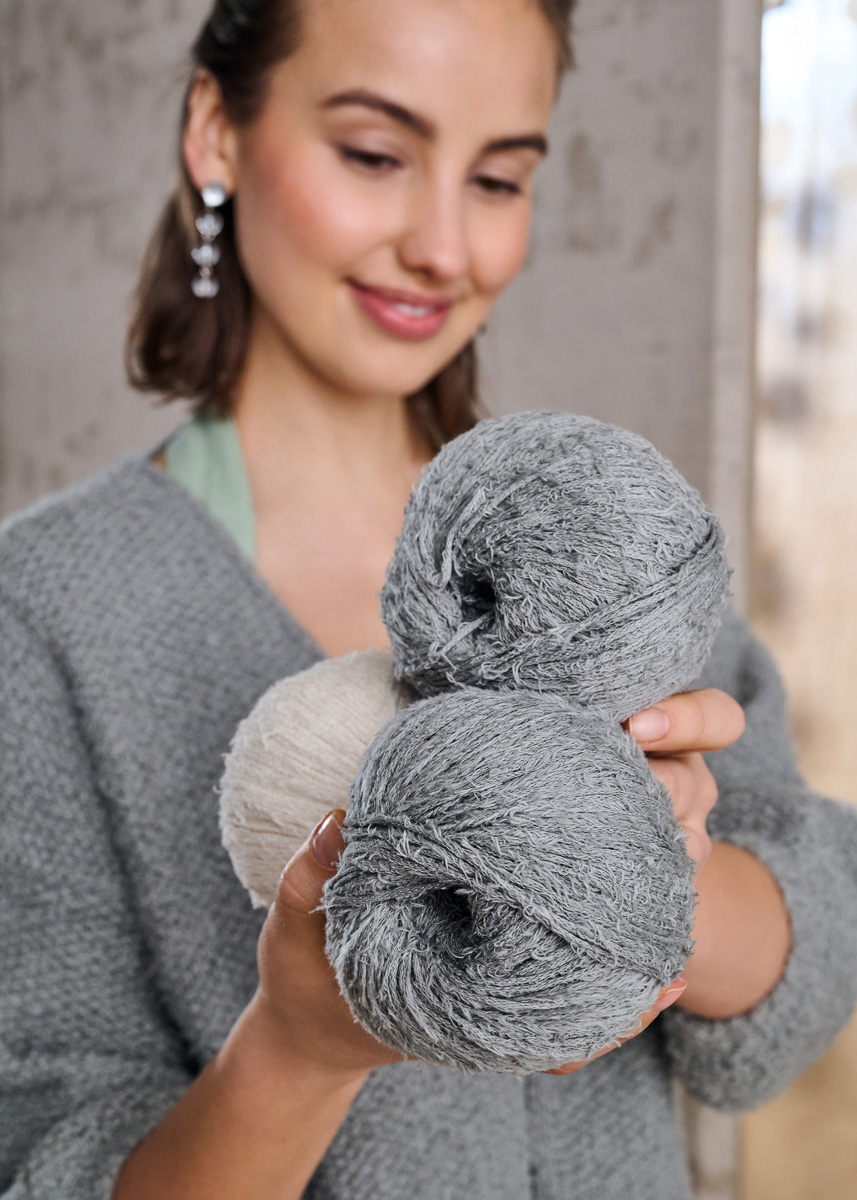 Lana Grossa Ella (100% Baumwolle, Lauflänge 130 m/50 g), 500 (550 – 600) g Grau (Fb. 13); Stricknadeln Nr. 3,5 und 4,5, sowie 1 Häkelnadel Nr. 3,5.