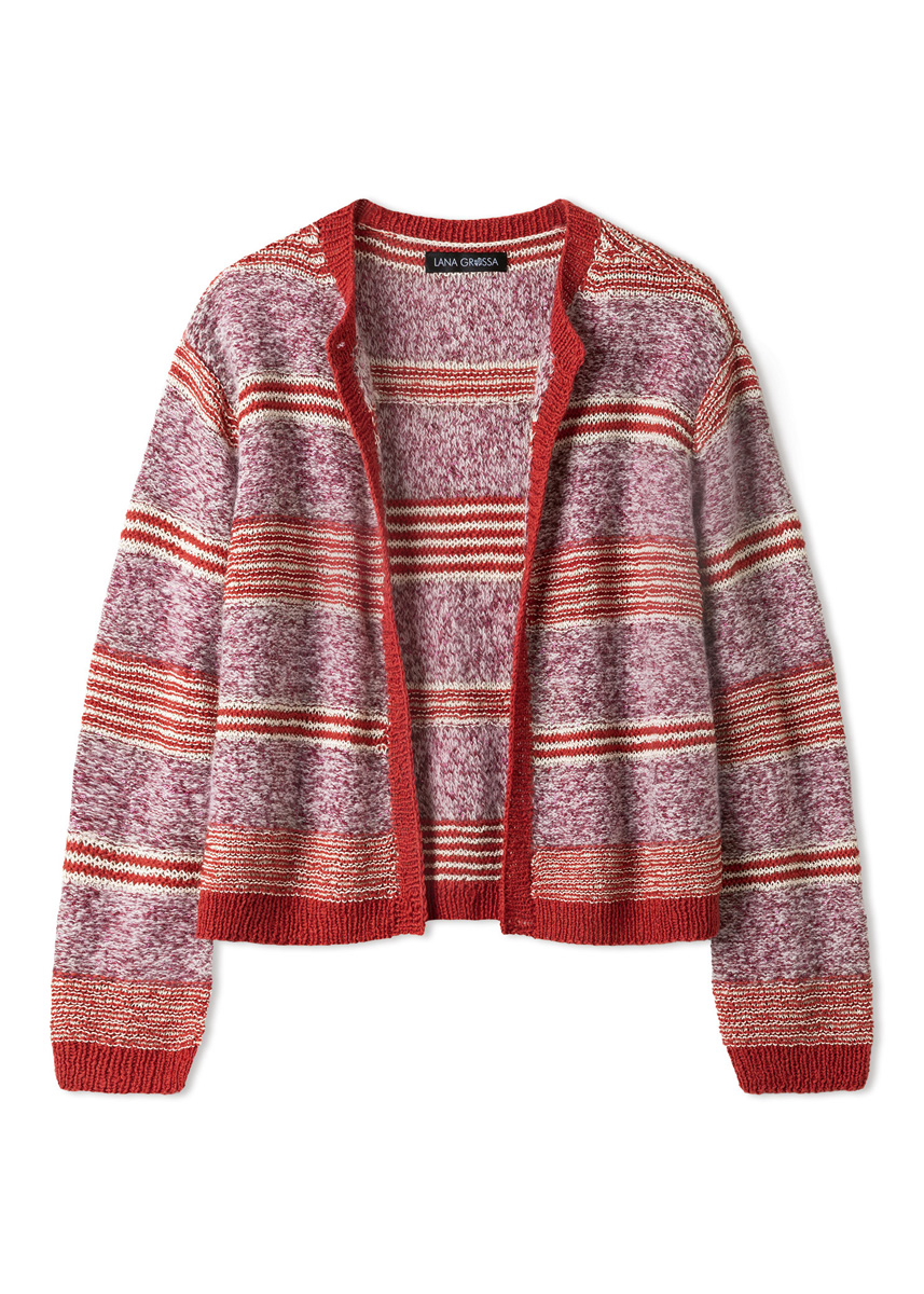 Lana Grossa-Qualität „Summer Cashmere“ (90 % Baumwolle, 10 % Kaschmir, LL = ca 210 m/50 g): ca 100 (150 - 150 - 200) g Orientrot (Fb 25); Lana Grossa-Qualität „Setasuri“ (69 % Alpaka (Suri), 31 % Seide, LL = ca 212 m/25 g): ca 75 (100 - 100 - 125) g Creme (Fb 2); Lana Grossa-Qualität „Filo Lurex“ (94 % Baumwolle, 6 % Polyester, LL = ca 145 m/50 g): ca 100 (100 - 150 - 150) g Creme (Fb 2); Lana Grossa- Qualität „Glamour“ (55 % Polyamid, 45 % Polyester, LL = ca 115 m/25 g): ca 125 (125 - 150 - 150) g Bordeaux (Fb 9); Stricknadeln Nr 3 und Nr 4; 1 Rundstricknadel Nr 3.