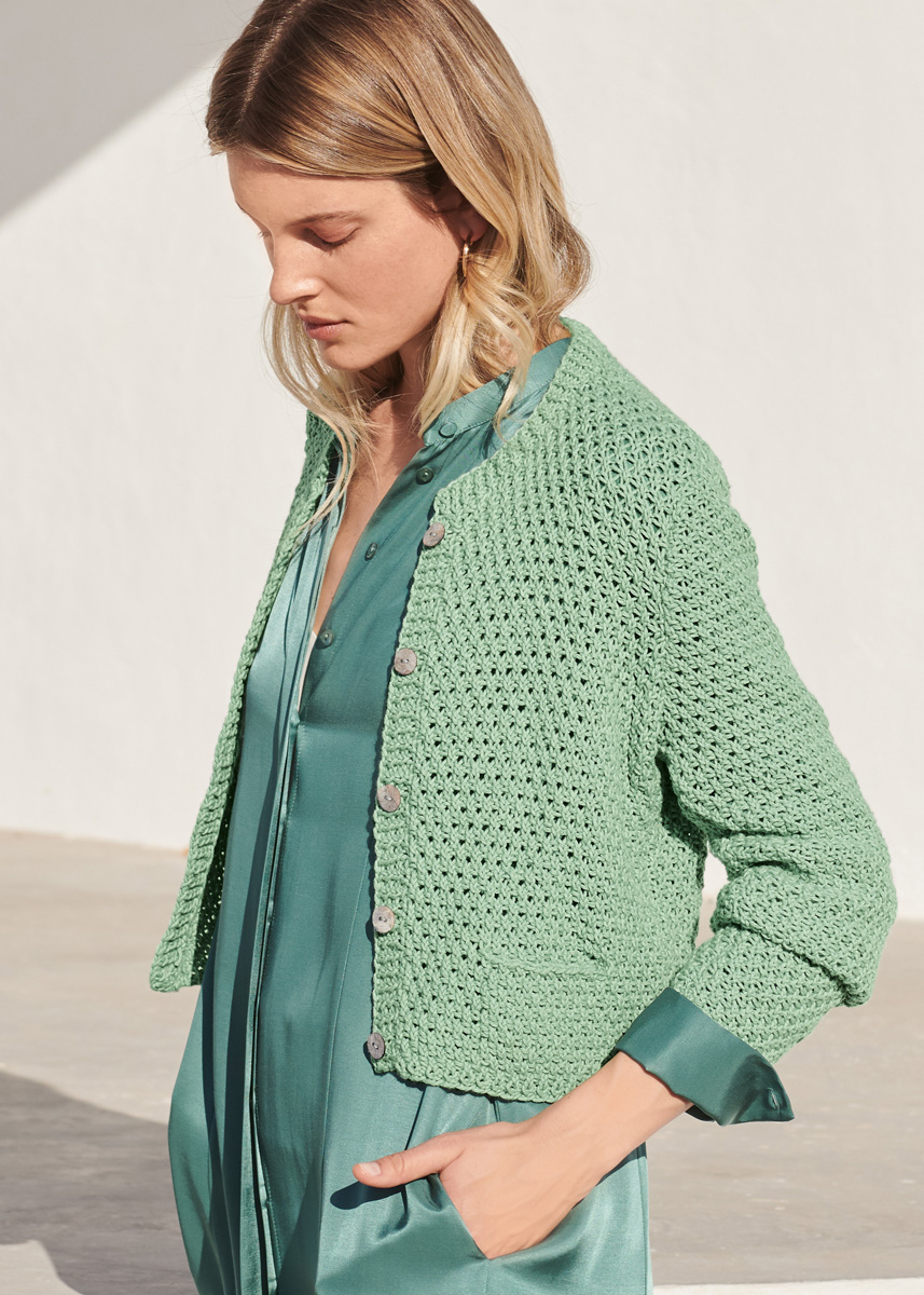 Pudriges Grün und winzige, eingestrickte Taschen machen diese Jacke wunderbar feminin. Struktur kommt über das hübsche Perlmuster, das auch Anfänger schnell in den Griff bekommen.