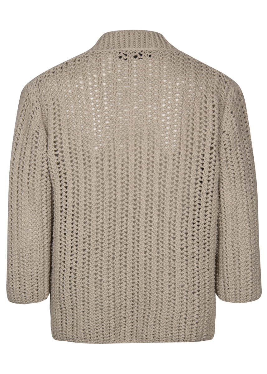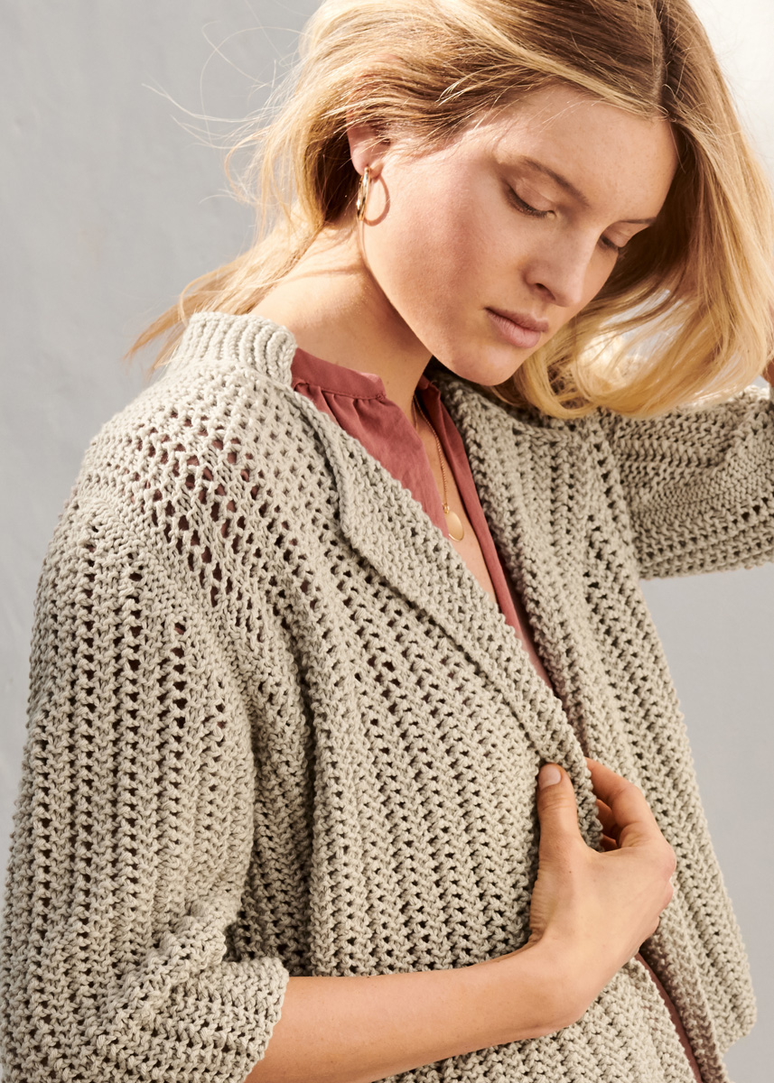 Lana Grossa Fourseason (45% Bio Schurwolle Merino extrafein, 40% Bio Baumwolle, 15% rec. Kaschmir, Lauflänge 105 m/50 g), 400 (450 – 500) g Graubeige (Fb 10); Stricknadeln Nr. 5 und 1 Rundstricknadel Nr. 4, 40 cm lang.