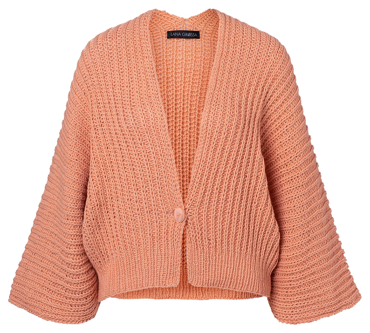 Lana Grossa Fourseason (45% Bio Schurwolle (Merino extrafine), 40% Baumwolle (Bio), 15% rec. Kaschmir, Lauflänge 105 m/50 g), 450 (500 – 500 – 550) g Apricot (Fb 20); Stricknadeln Nr. 4 und 1 Rundstricknadel Nr. 5, 80 cm lang, 1 Häkelnadel Nr. 4, 1 Knopf von UNION KNOPF, Fb Apricot, Gr. 25 mm.