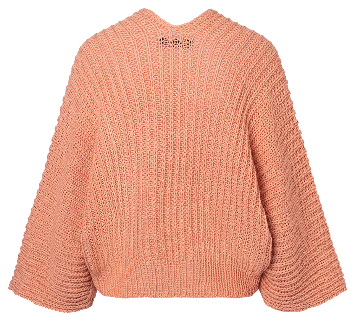 Schminken? Unnötig, denn hier sorgt Apricot für einen frischen Teint. Gestrickt wird, ganz simpel, im Halbpatent. Die verkürzten Fledermausärmel betonen den femininen Look.