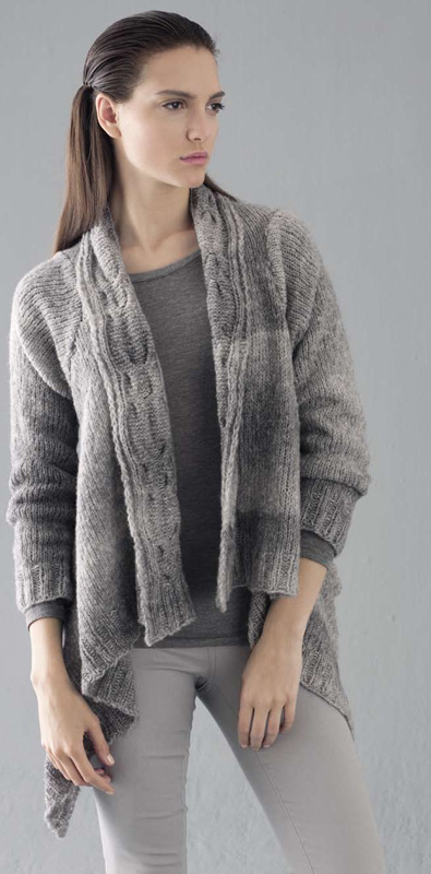 Lana Grossa-Qualität „Fumato” (42% Schurwolle Merino extrafine, 18% Baby Alpaka, 40% Polyamid, LL = ca. 225 m/50 g): ca. 250 (300 – 350) g Hell-/Dunkelgrau gestreift (Fb. 9); Stricknadeln Nr. 5,5 und 6, je 1 Rundstricknadel Nr. 5,5 und 6, 80 cm lang.