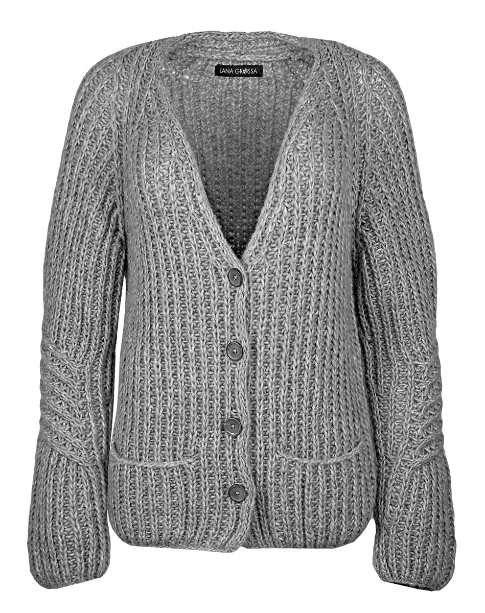 Lana Grossa Fusione (30% Baumwolle, 26% Schurwolle Merino extrafein, 25% Baby Alpaka, 19% Polyamid, Lauflänge 140 m/50 g), 400 (450 – 500) g Hell-/Gelbgrün meliert (Fb 9); Stricknadeln Nr. 6 und 7, 1 Zopfnadel, 4 Knöpfe von UNION KNOPF, Art. 36428, Fb 22, Gr. 22 mm.