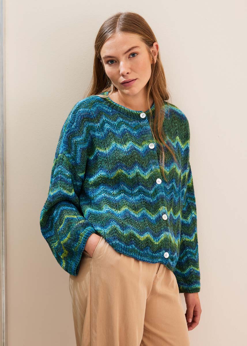 Lana Grossa-Qualität „Gianna“ (80 % Baumwolle (Bio), 15 % Schurwolle (Merino), 5 % Kaschmir, LL = ca 180 m/50 g): ca 350 (450 - 550) g Blau/Grün/Türkis/Grau (Fb 5); Stricknadeln Nr 4 und 4,5; 5 Perlmuttknöpfe, Durchmesser 18 mm.