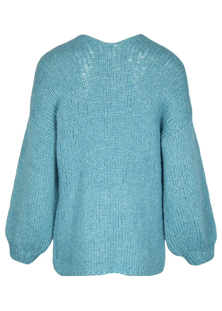 Feminine Ballonärmel, ein vertiefter, rückwärtiger Halsausschnitt und ein frischer Türkiston: Dieses Modell ist simpel gestrickt – und trotzdem schön stylisch.