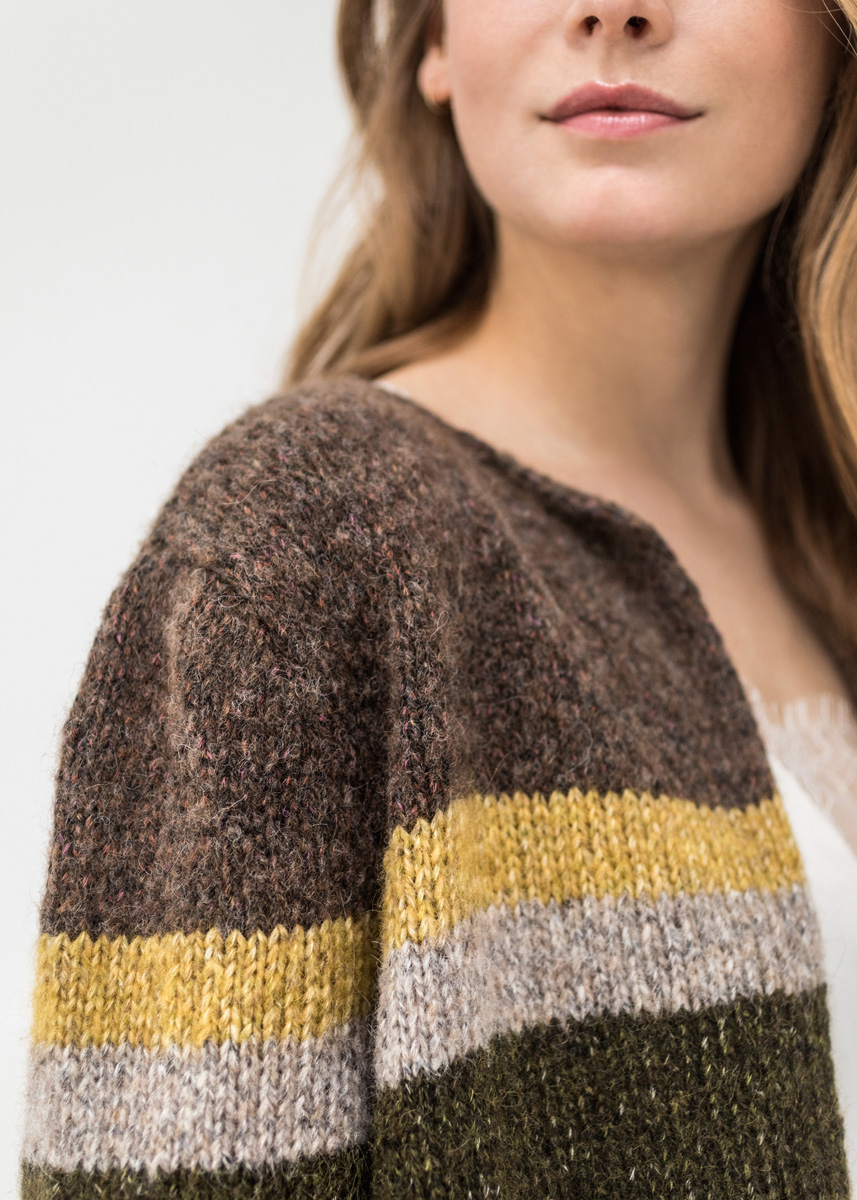 Lana Grossa-Qualität „Sara” (65 % Baumwolle, 30 % (Baby) Alpaka, 5 % Schurwolle (Merino), LL = ca. 125 m/50 g): ca. 200 (250) g Graubraun meliert (Fb. 5), je ca. 100 g Gelb meliert (Fb. 13) und Dunkeloliv meliert (Fb. 14) und ca. 50 g Beige meliert (Fb. 6); Stricknadeln Nr. 5,5, 1 Wollhäkelnadel Nr. 5.