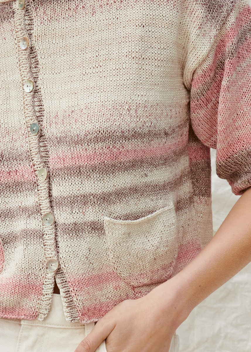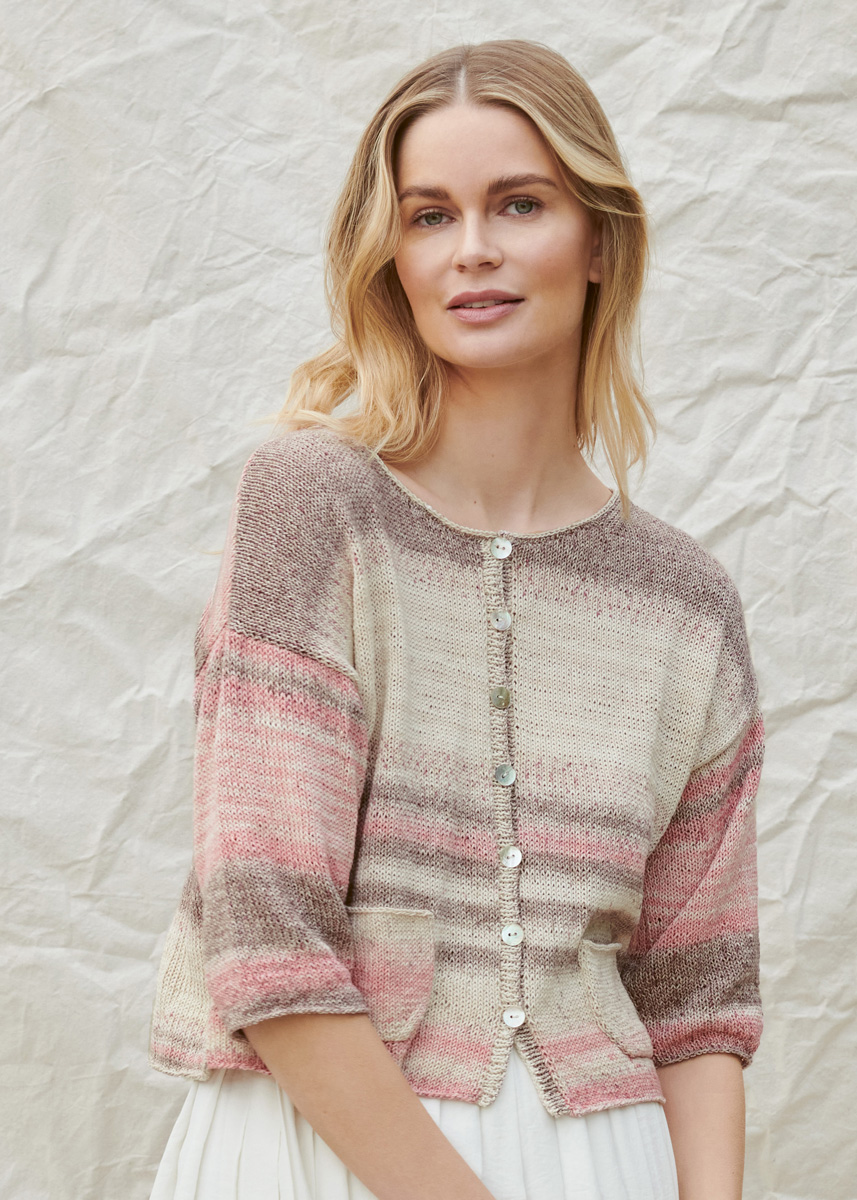 Ultraleichte JACKE mit kleinen aufgesetzten Taschen und schmaler Knopfleiste, halbem Arm. Glatt rechts im schönen Farbverlauf-Garn ARUBA.