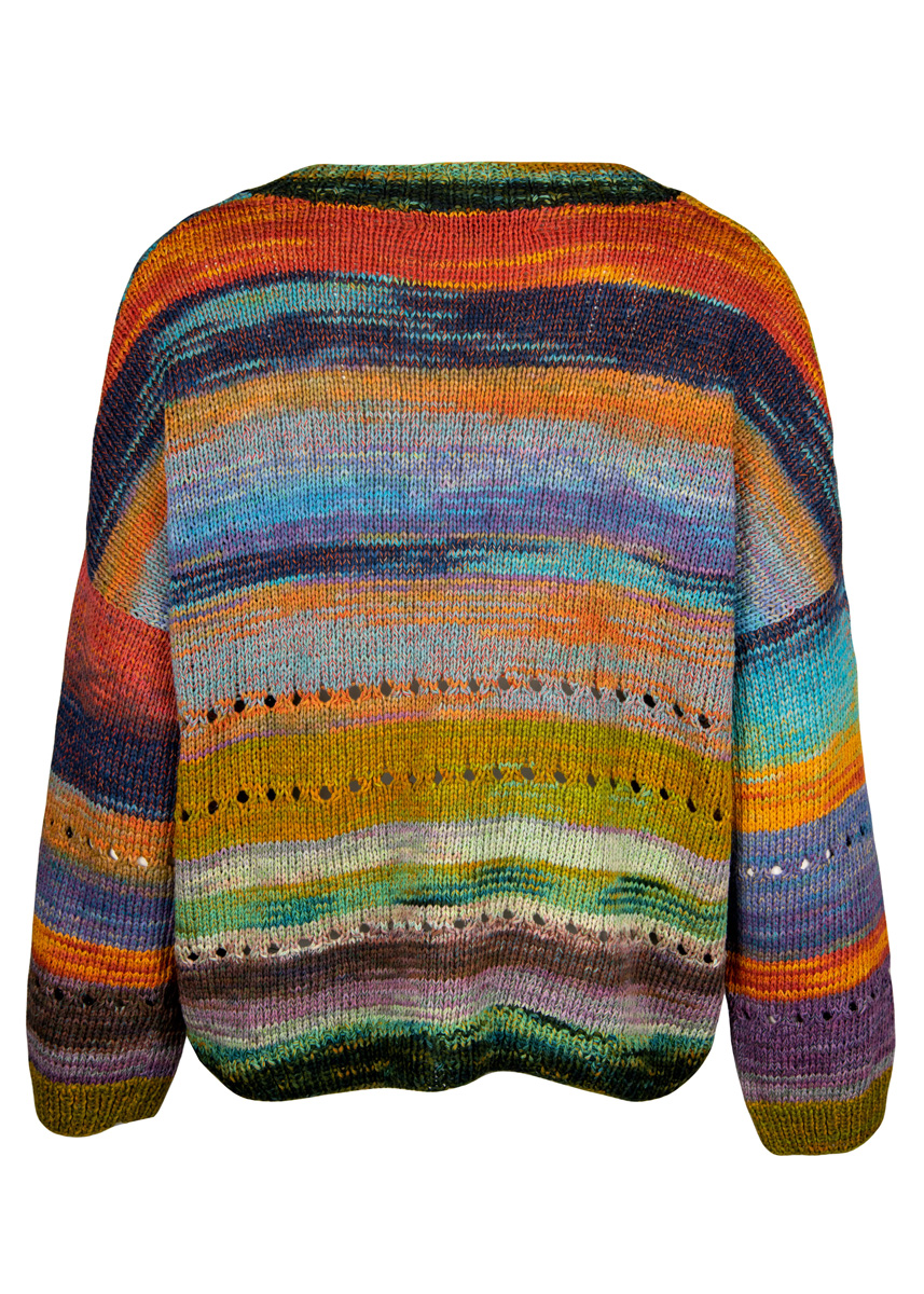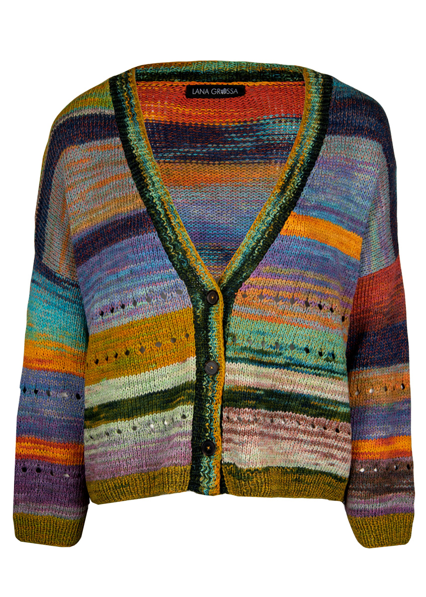 Klare und gebrochene Töne bescheren dieser Jacke ihr außergewöhnliches Farbenspiel. Das Lochmuster setzt einen femininen Akzent, der sich auch mit Kleidern sehr gut versteht.
