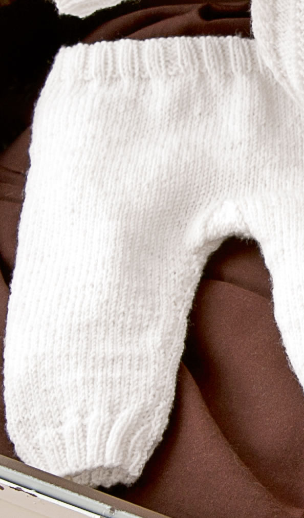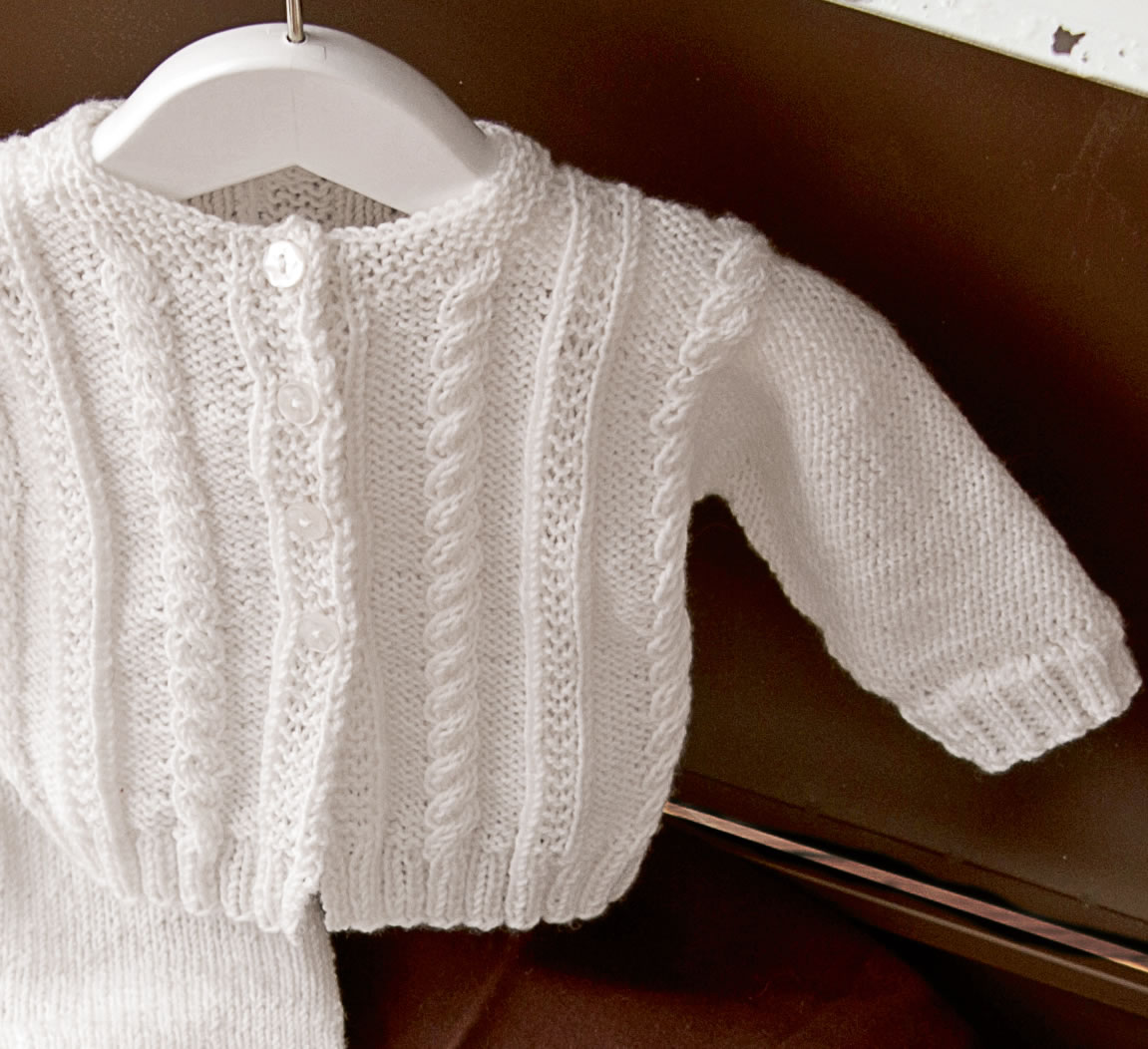 Lana Grossa Qualität Cool Wool Baby, 100 % Schurwolle, Lauf- länge 220 m/50 g; 150 g Weiß (Fb 207); Stricknadeln Nr. 3, eine kurze Rundstricknadel Nr. 3, ein Stricknadelspiel Nr. 3, eine Häkelnadel Nr. 2,5; sechs Knöpfe und ein Gummiband.