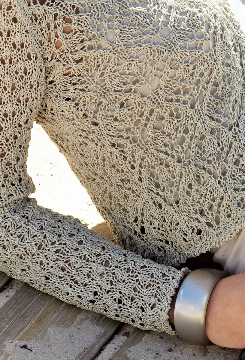Lana Grossa-Qualität „Divino” (75 % Baumwolle, 25 % Viskose, LL = ca. 110 m/50 g): ca. 350 (400) g Grün (Fb. 38); Stricknadeln Nr. 4 und 4,5, 1 Wollhäkelnadel Nr. 3,5; 3 Knöpfe von Union Knopf, Art. 450776, 23 mm Ø, Fb. 14 beige.