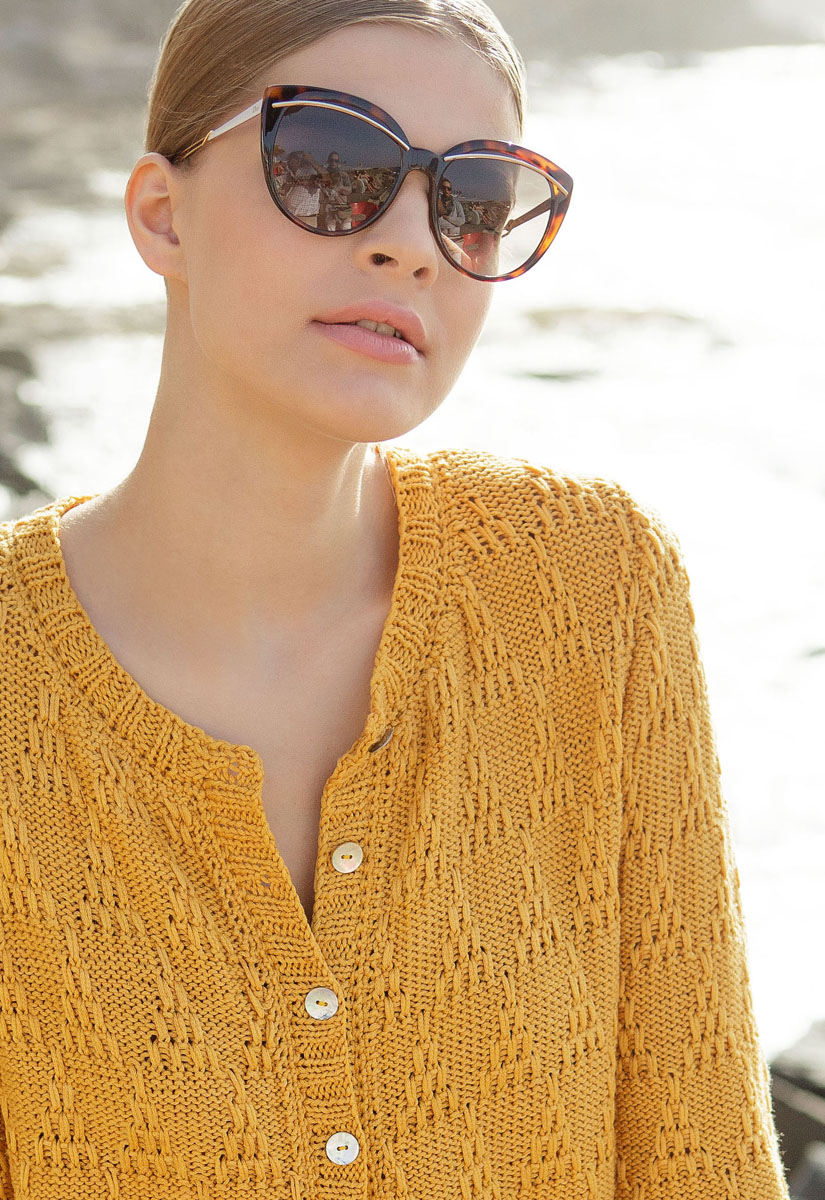 Lana Grossa-Qualität „Seta” (60 % Seide, 40 % Baumwolle, LL = ca. 115 m/50 g): ca. 450 (500 – 550) g Melonengelb (Fb. 8); Stricknadeln Nr. 4 und 5, 1 Rundstricknadel Nr. 4, 80 cm lang, 1 Wollhäkelnadel Nr. 3,5; 9 Perlmuttknöpfe von Union Knopf, Art. 37604, 15 mm ø, Fb. 12 natur.