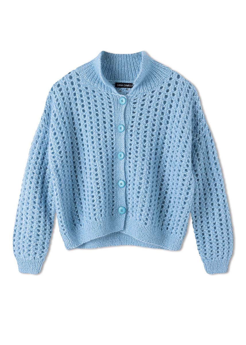 Lana Grossa-Qualität „Ecopuno” (72 % Baumwolle, 17 % Schurwolle (Merino), 11 % (Baby) Alpaka, LL = ca. 215 m/50 g): ca. 300 (300 – 350) g Pastellblau (Fb. 207) und Lana Grossa-Qualität „Silkhair” (70 % Mohair (Superkid), 30 % Seide, LL = ca. 210 m/25 g): ca. 125 (125 – 150) g Zartblau (Fb. 201); Stricknadeln Nr. 3,5 und 4, 1 Rundstricknadel Nr. 3,5, 80 cm lang; 5 Knöpfe, ø 25 mm, türkisblau.