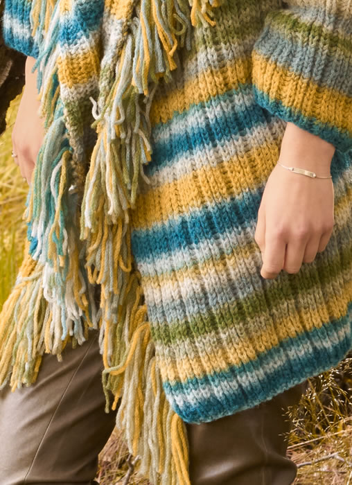 Lana Grossa-Qualität „Colorato” (87 % Schurwolle, 13 % Polyamid, LL = ca. 135 m/50 g): ca. 650 (700) g Gelb/Grün/Petrol/Graugrün/Grüngrau (Fb. 8); Stricknadeln Nr. 5 und 5,5, 1 Wollhäkelnadel Nr. 5.