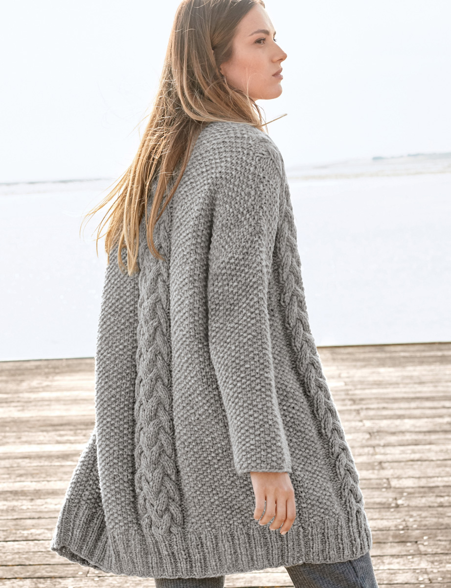 ZÖPFE IN KOMBINATION mit Perlmuster und einem klassischen Schalkragen sind nun wirklich nicht neu, bekommen aber durch das Garn einen ganz modernen Look. Das Schlauchgarn ist viel leichter als es aussieht, dennoch darf man mit dicken Nadeln stricken und ist ganz schnell fertig. Das perfekte Projekt für eine Woche Winterurlaub.