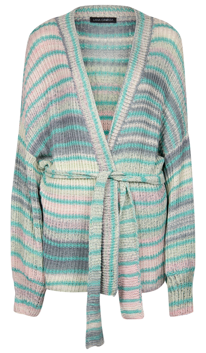 Lana Grossa-Qualität „Aruba” (72 % (Bio) Baumwolle, 28 % rec. Polyamid, LL = ca. 380 m/100 g): ca. 400 (500) g Rohweiß/Rosa/Grau/Dunkelgrau/Zartgrün (Fb. 14) und Lana Grossa-Qualität „Solo Lino” (80 % rec. Leinen (Viskose), 20 % Leinen, LL = ca. 120 m/50 g): ca. 250 (300) g Türkis (Fb. 36); Stricknadeln Nr. 4, 1 Rundstricknadel Nr. 4, 120 cm lang, 1 Wollhäkelnadel Nr. 3,5; ca. 65 (70) cm farblich passendes Nahtband.