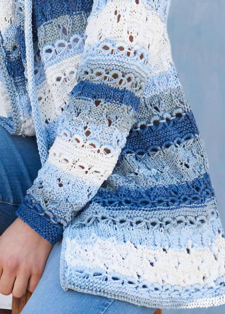 Lana Grossa-Qualität „Di Moda” (82 % Viskose, 18 % Polyester, LL = ca. 100 m/50 g): ca. 800 (850) g Weiß/Hellgrau/Hellblau/Blau (Fb. 1); Stricknadeln Nr. 5, 1 Rundstricknadel Nr. 5, 80 cm lang.