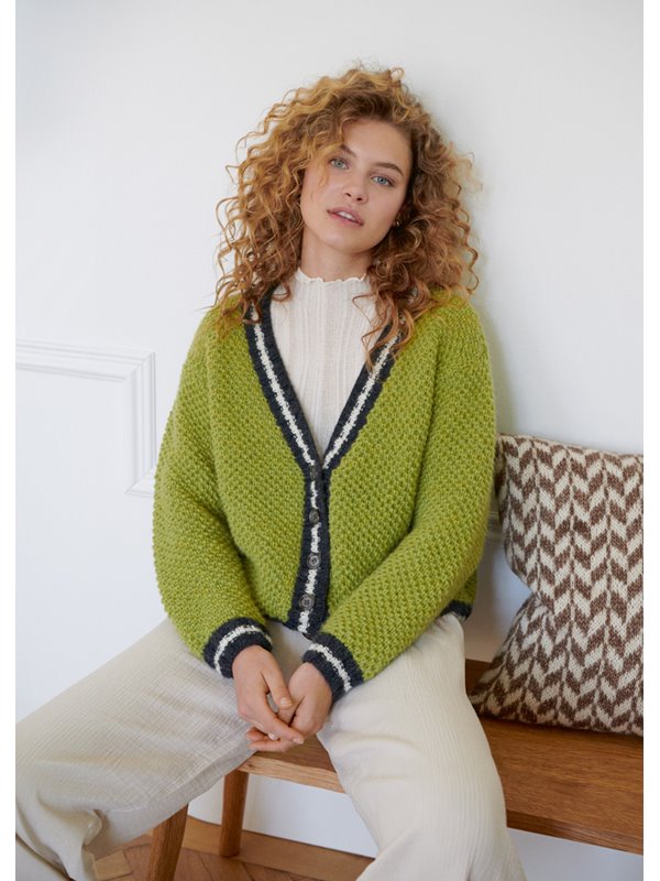 Lana Grossa-Qualität „Brigitte No. 2” (47 % (Baby) Alpaka, 45 % Baumwolle, 8 % Schurwolle (Merino), LL = ca. 140 m/50 g): ca. 350 (400) g Zartgrün (Fb. 58) und je ca. 50 g Rohweiß (Fb. 16) und Schwarz (Fb. 36); Stricknadeln Nr. 5,5, je 1 Rundstricknadel Nr. 5, 60 und 100 cm lang, 5 Knöpfe in Dunkelgrau, ø 18 mm.