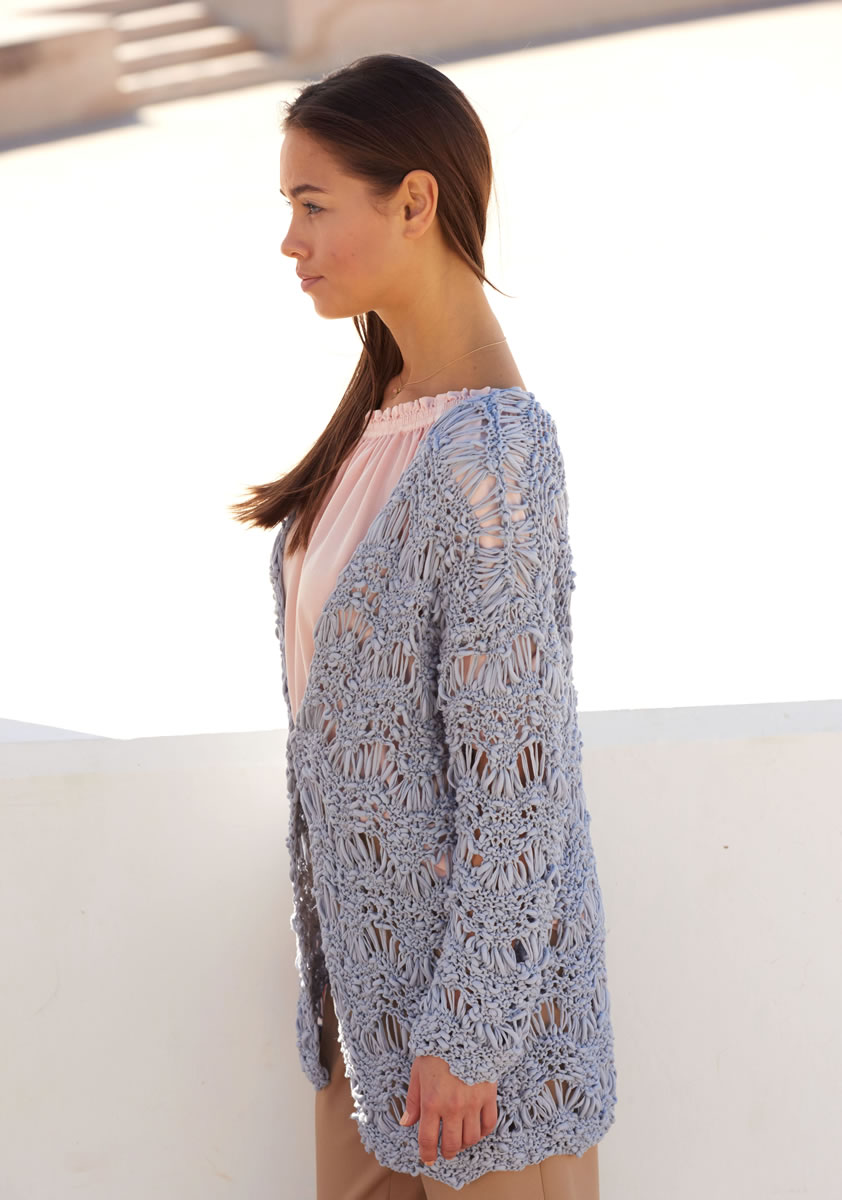 LIEBLINGSSTÜCK! Es hat alles, was wir uns für diesen Sommer wünschen: luftige Transparenz durch Hebemaschen, aus einem noppigen Baumwollgarn gestrickt, dazu extra schmale, lange Ärmel. Wie schön!