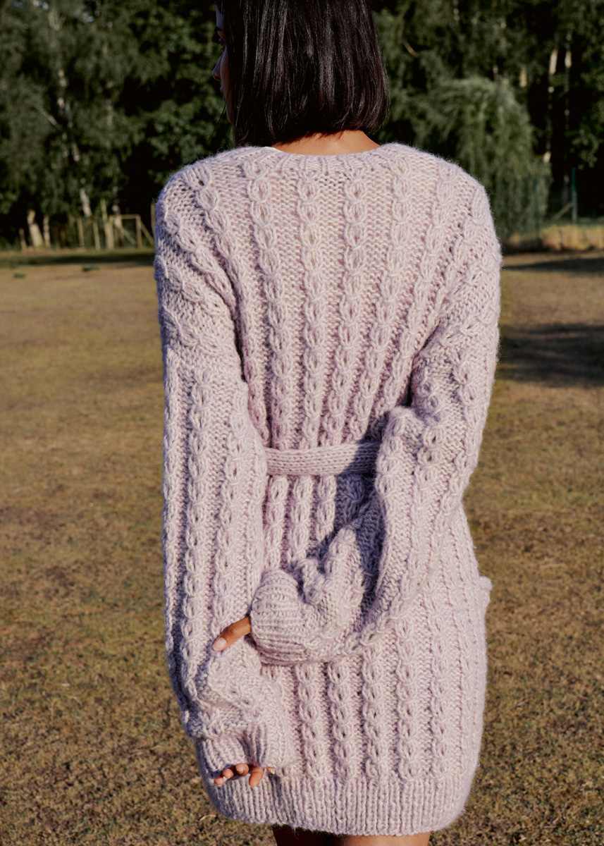 Flieder ist die Trendfarbe der Stunde. Diese entspannte Jacke präsentiert sich in einer melierten Nuance und punktet außerdem mit feinen Zöpfen, die sich – ganz einfach – ohne Zopfnadel stricken lassen.