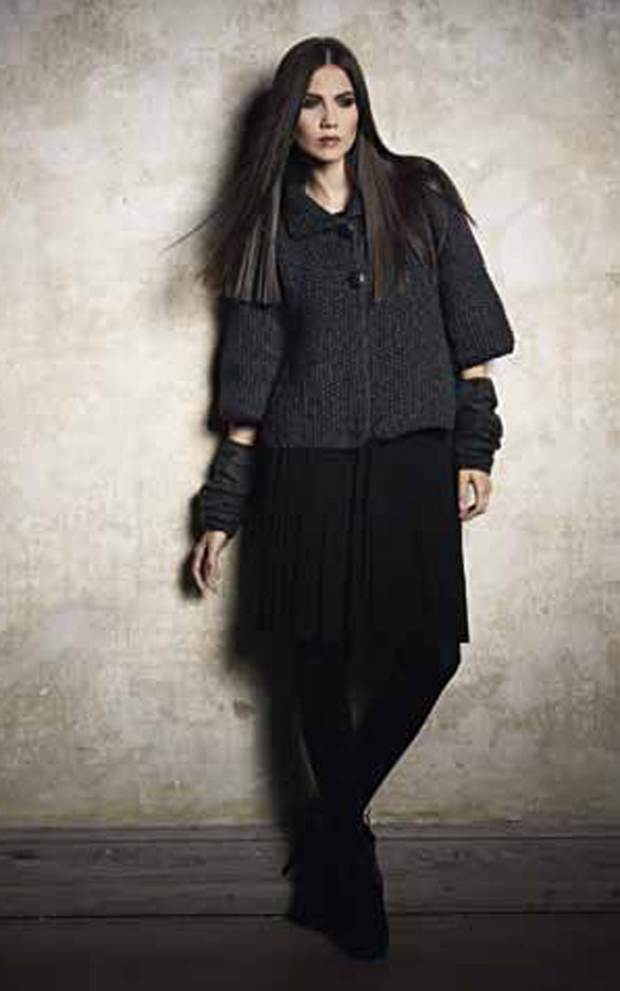 Lana Grossa-Qualität „Garzato Baby” feinste Merinowolle mit Baby Alpaka (65 % Alpaka, 20 % Schurwolle, 15 % Polyamid, LL = ca. 70 m/50 g): ca. 550 (600) g Anthrazit (Fb. 11); Stricknadeln Nr. 8, 1 Rundstricknadel Nr. 7, 80 cm lang; 2 Knöpfe von Union Knopf, Art. 450660, Fb. 80 schwarz, 34 mm Ø.