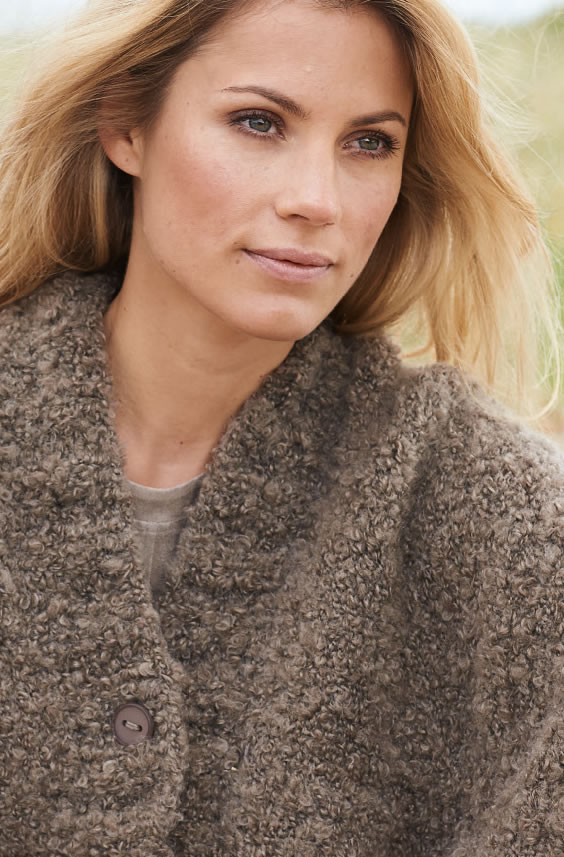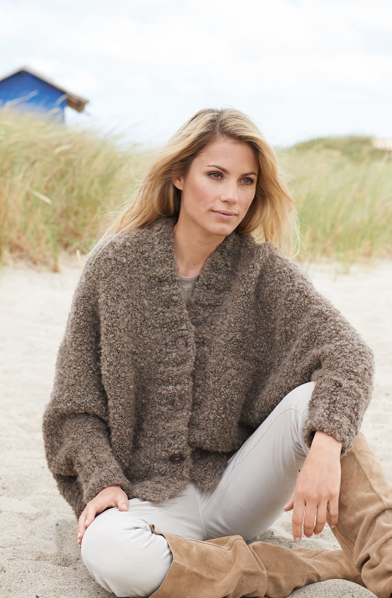 Lana/Grossa-Qualität „Bombolo” (40 % Polyacryl, 30 % Mohair, 20 % Schurwolle (Merino), 10 % Polyamid, LL = ca. 65 m/50 g): ca. 550 (600) g Hellbraun (Fb. 2); Stricknadeln Nr. 7, 1 Rundstricknadel Nr. 6,5, 120 cm lang, Spielstricknadeln Nr. 6,5; 3 Knöpfe von Union Knopf, Art. 451496, 25 mm ø, Fb. 56 braun.