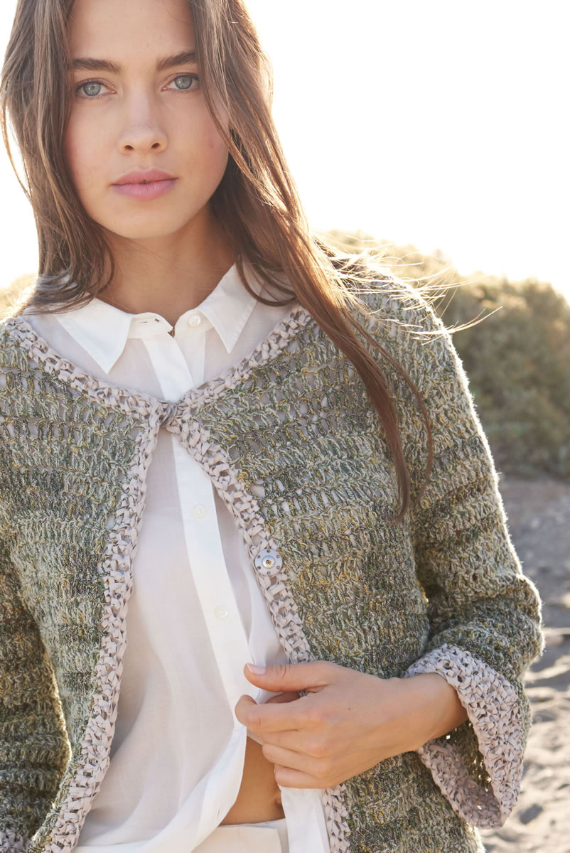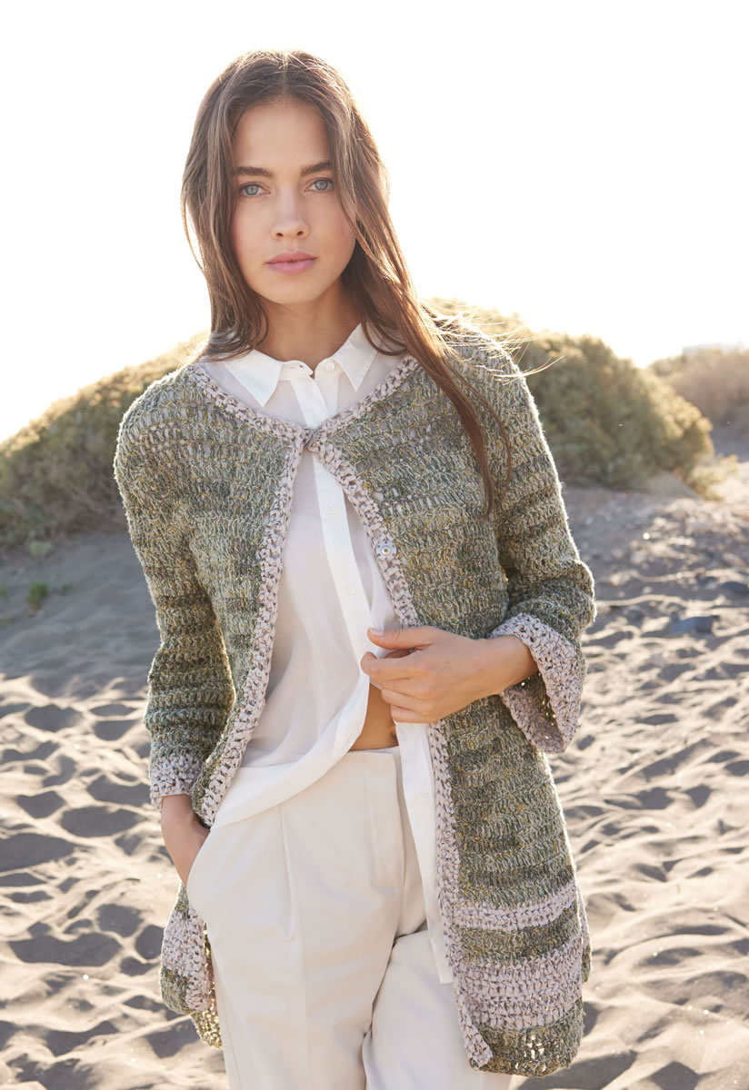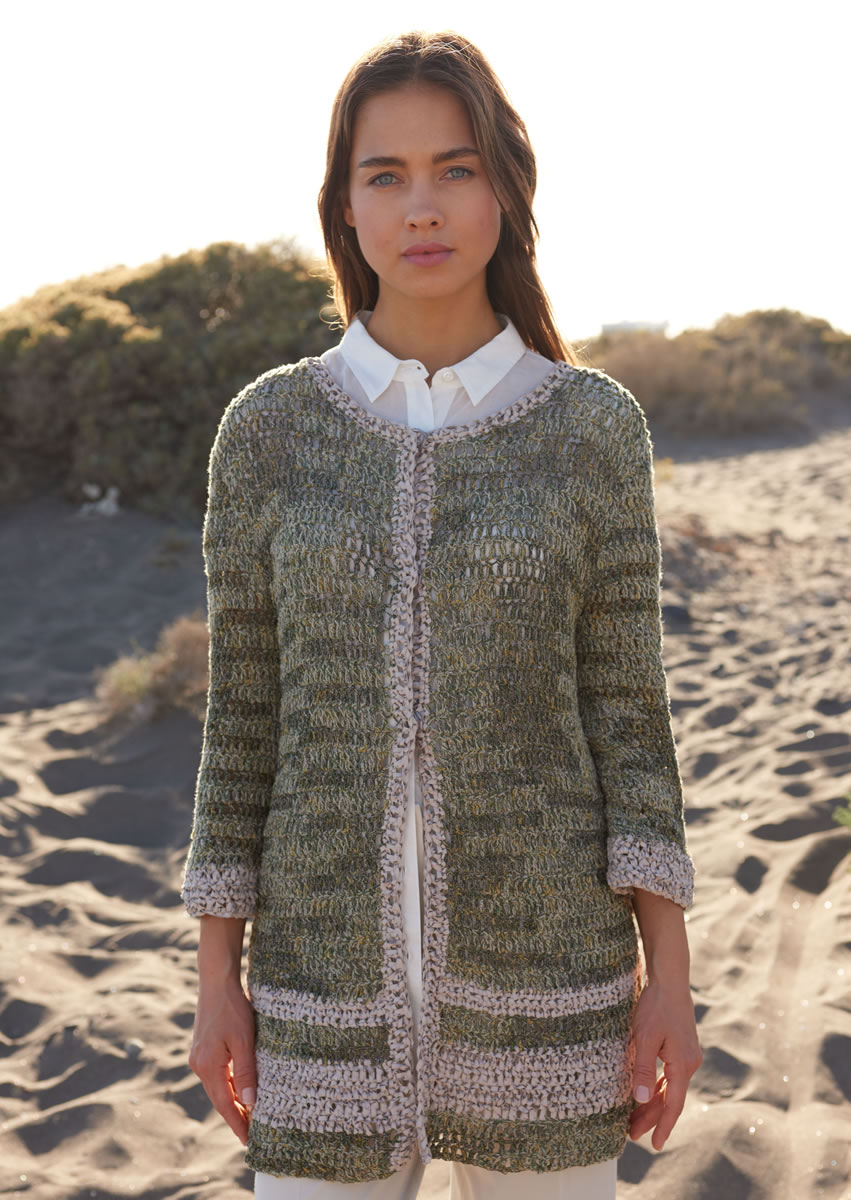 Lana Grossa-Qualität „Coco” (67 % Baumwolle, 33 % Nylon, LL = ca. 115 m/50 g): ca. 350 (400 – 450) g Natur/Senf/Graugrün (Fb. 4) und Lana Grossa-Qualität „Alcanto” (70 % Polyester, 30 % Polyamid, LL = ca. 125 m/50 g): ca. 100 (100 – 150) g Grège (Fb. 7); 1 Wollhäkelnadel Nr. 6; 3 Annähdruckknöpfe von Union Knopf, Art. 19630, 20 mm ø, Fb. 74 hellgrau