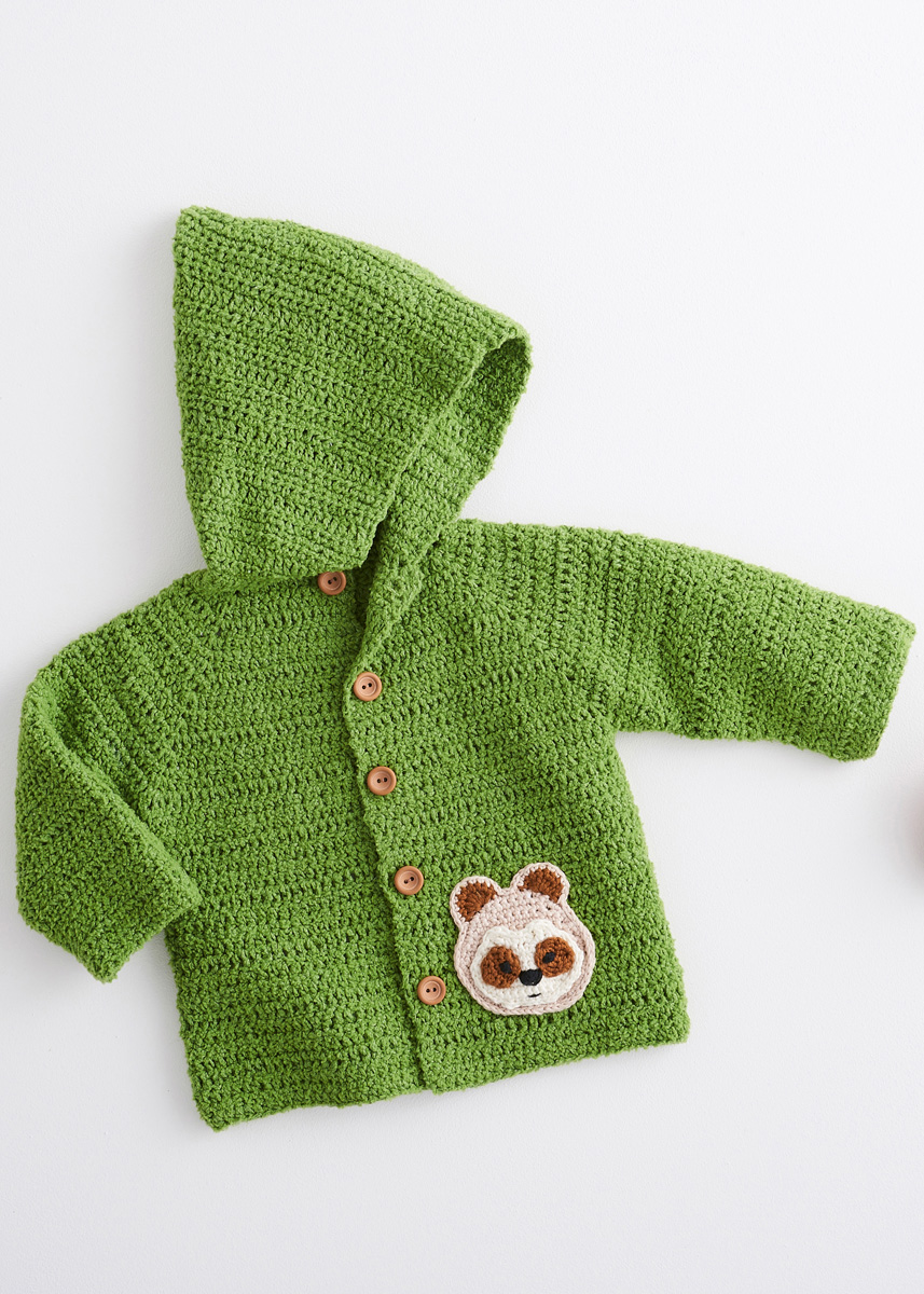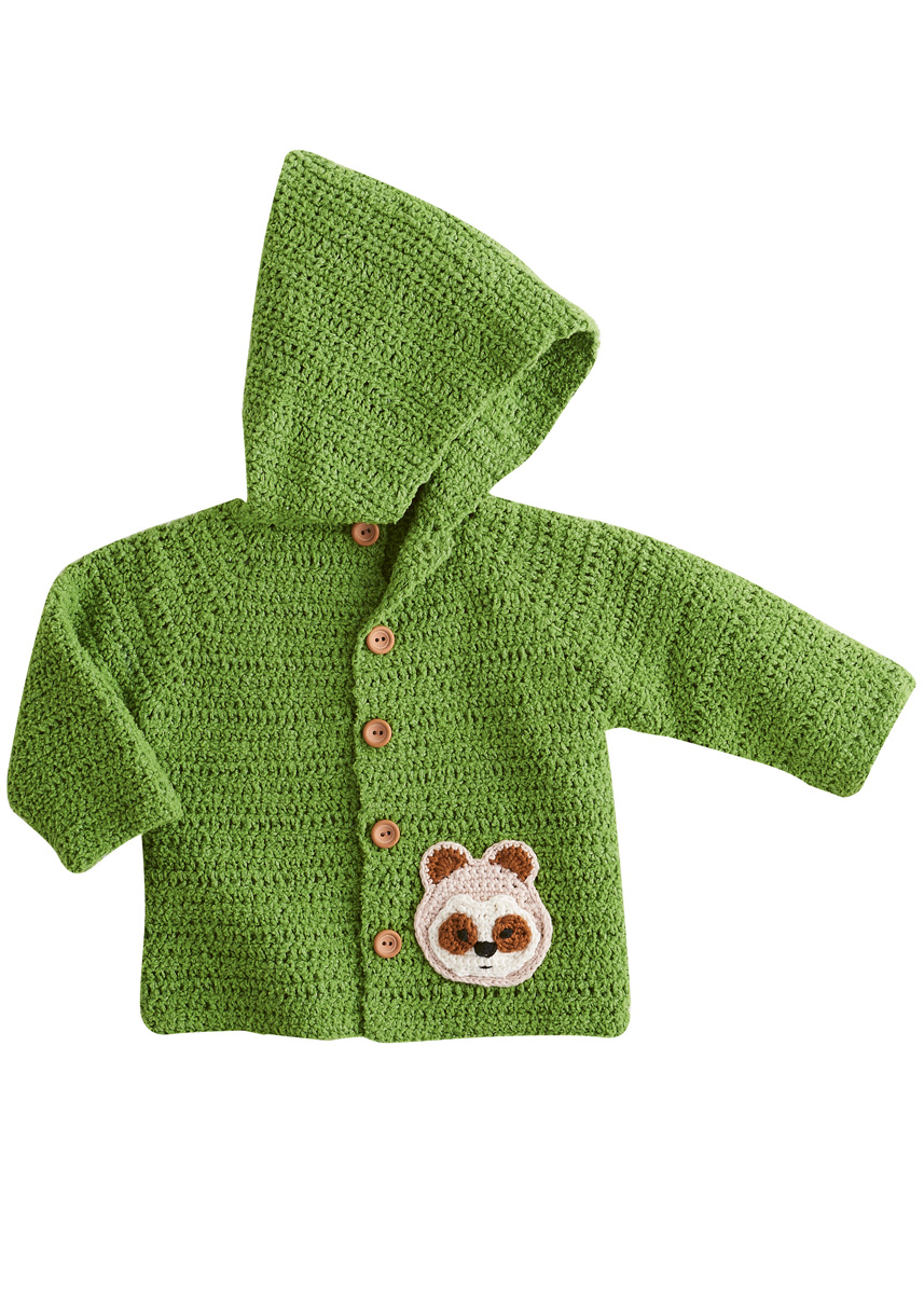 Lana Grossa Jolie (75 % Baumwolle, 25 % Polyamid, Lauflänge 120 m/50 g) 200 (250/300/350) g Laubgrün (Fb 5) und Soft Cotton (70 % Baumwolle, 30 % Mikrofaser, Lauflänge 140 m/50 g) 50 g Nussbraun (Fb 33), 50 g Ecru (Fb 2), 50 g Schwarz (Fb 34) und 50 g Grége (Fb 3); Häkelnadel Nr. 3 und 4, fünf Knöpfe mit 17 mm Ø.