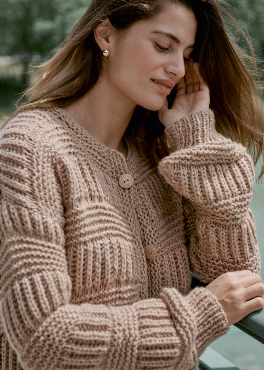Mit moderaten Ballonärmeln und einem plastischen Mustermix (Vollpatent und krause Maschen) wirkt dieser Klassiker modern und ausdrucksvoll.