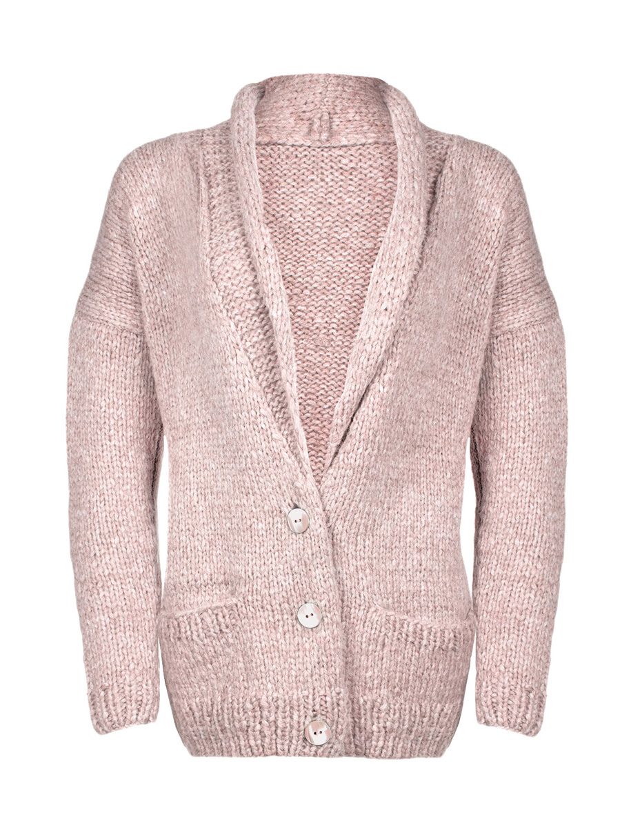 Lana Grossa Lala Berlin Lovely (52 % Alpaka, 18 % Kaschmir, 18 % Schurwolle, 12 % Polyamid, Lauflänge 90 m / 50 g) 500 (550 – 600) g Rosa meliert (Fb 1); Stricknadeln Nr. 5,5 und 7; drei Knöpfe mit 25 mm Durchmesser.