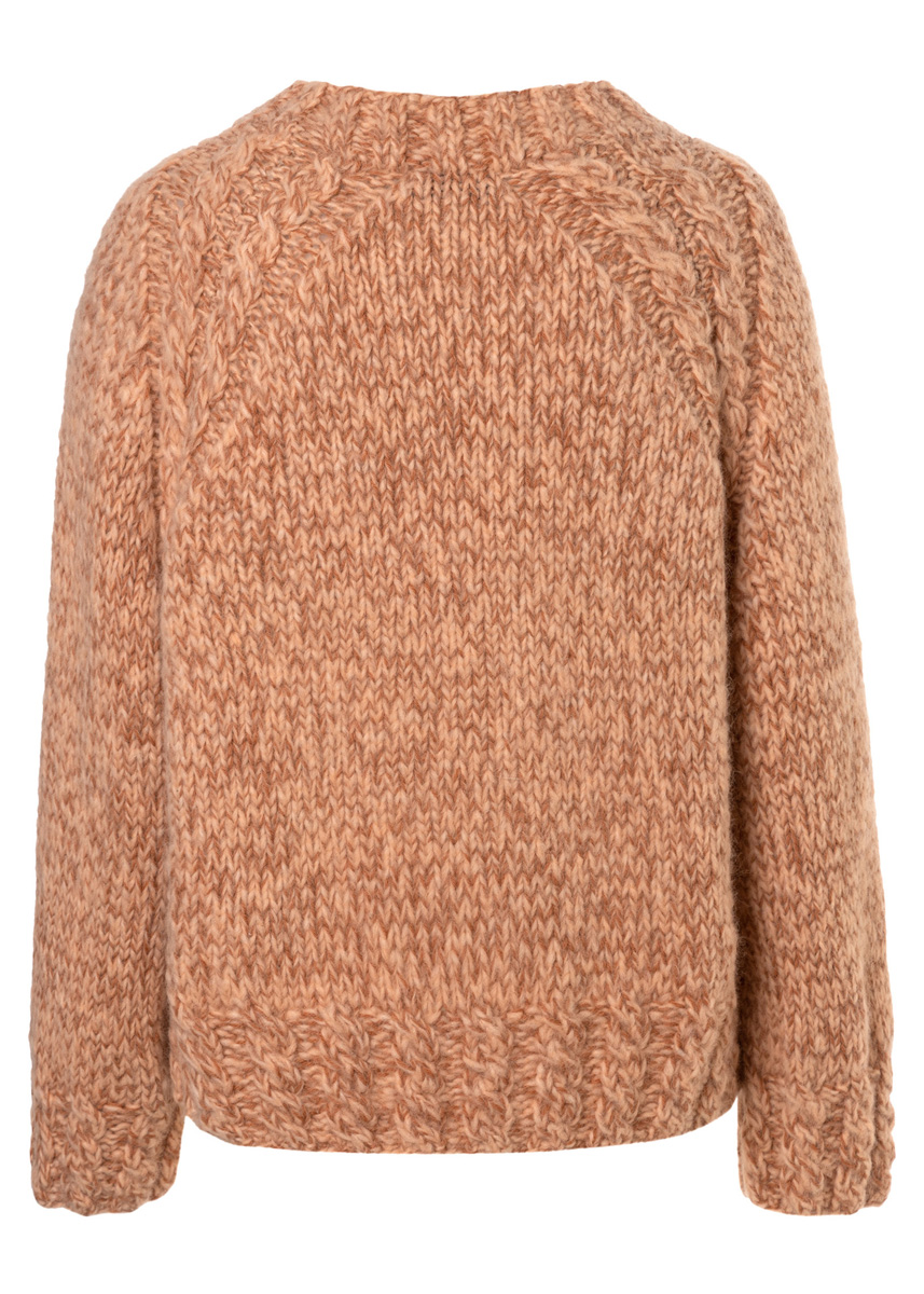 Lana Grossa-Qualität „Landlust Alpaka Merino 160” (50 % (Baby) Alpaka, 50 % Schurwolle (Merino), LL = ca. 160 m/50 g): ca. 250 (300) g Hellbraun (Fb. 426) und „Alpaca Moda” (74 % Alpaka (Baby), 13 % Schurwolle (Merino), 13 % Polyamid, LL = ca. 135 m/50 g): ca. 300 (350) g Lachs (Fb. 22); Stricknadeln Nr. 8, 1 Rundstricknadel Nr. 8, 50 cm lang, 1 Hilfsoder Zopfnadel; 3 Knöpfe von Union Knopf, 25 mm Ø, in Hellbraun Fb. 0161, Art. 0028450.