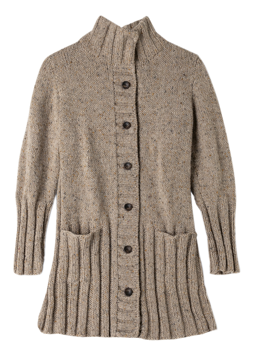 Lana Grossa Landlust Soft Tweed 90 (100% Schurwolle, Lauflänge 90 m/50 g), 800 (900 – 1000) g Beige meliert (Fb 2); Stricknadeln Nr. 5, 1 Rundstricknadel Nr. 5, 60 cm lang, 1 Wollsticknadel, sowie 6 Knöpfe von UNION KNOPF, Fb Braun, Ø 22 mm.