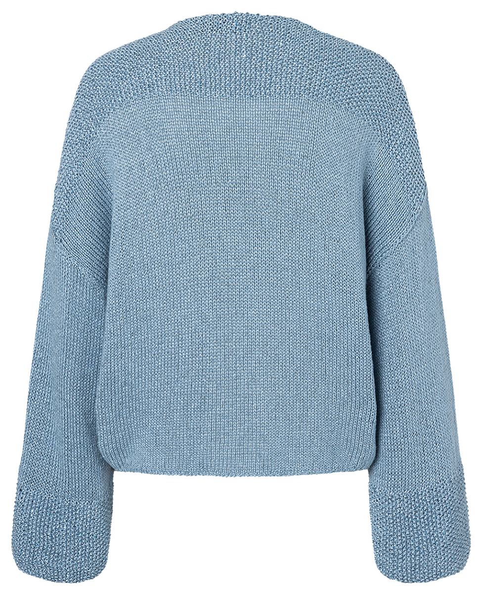 Lana Grossa Linarte (40% Viskose, 30% Baumwolle, 20% Leinen, 10% Polyamid, Lauflänge 125 m/50 g), 550 (600 – 650) g Graublau (Fb 76) und Lana Grossa Diamante (100% Polyester, Lauflänge 195 m/25 g), 75 (100 – 100) g Hellblau (Fb 9); Stricknadeln Nr. 4 und 5.