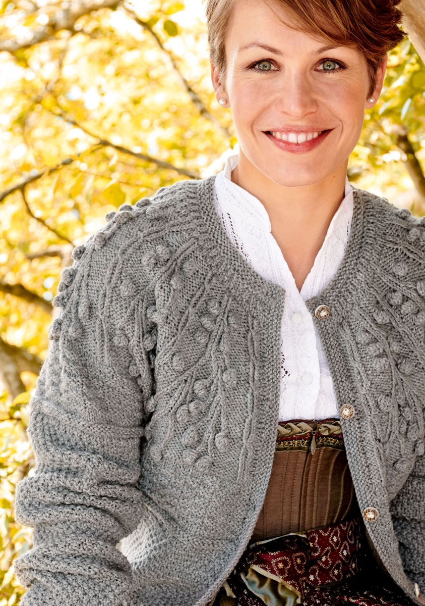 Unsere Jacken haben zwar klassische Trachtenjackenformen, aber wir haben uns was getraut und moderne Elemente hinzu geschummelt. Die graue Jacke hat zur Abwechslung eine Rundpasse mit ganz aktuellem Noppenmuster und den knappen kleinen Janker auf Seite 23 haben wir mit farbigen Tascheneinfassungen und einer Volantkante an der Knopfleiste im wahrsten Sinne des Wortes aufgerüscht.