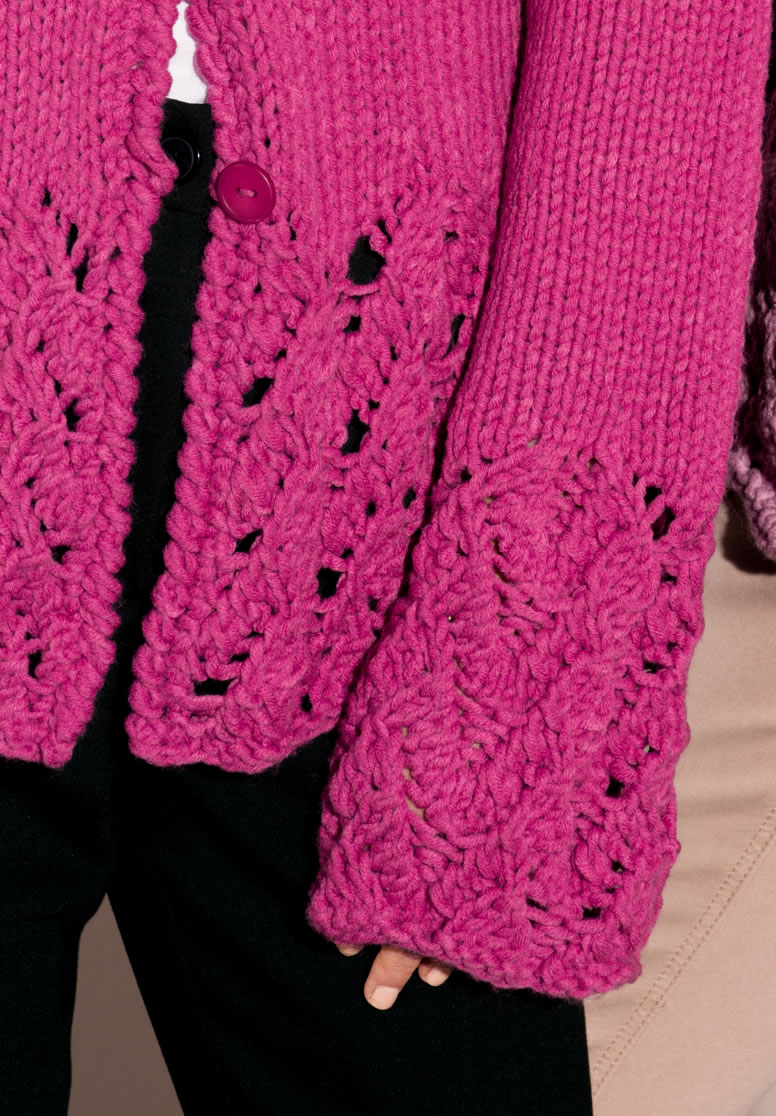 Lana Grossa Qualität „Mille II“ (50 % Schurwolle, 50 % Polyacryl, Lauflänge 55 m/50 g), 600 (650/700) g Fuchsia (Fb 84), Stricknadeln Nr. 7, eine Häkelnadel Nr. 6, fünf Knöpfe von Union Knopf (Art. 415978) mit 22 mm Durchmesser.