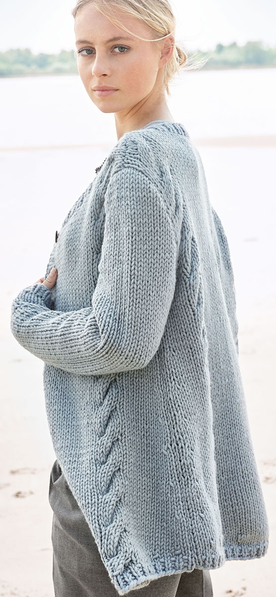 Lana Grossa Mille II (50% Schurwolle Merino extrafine, 50% Acryl, Lauflänge 55 m/50 g), 650 (700 – 750) g Graublau (Fb 96); Stricknadeln Nr. 7 und 5 Knöpfe von UNION KNOPF, Art. 452691, Fb 76, Gr. 24 mm