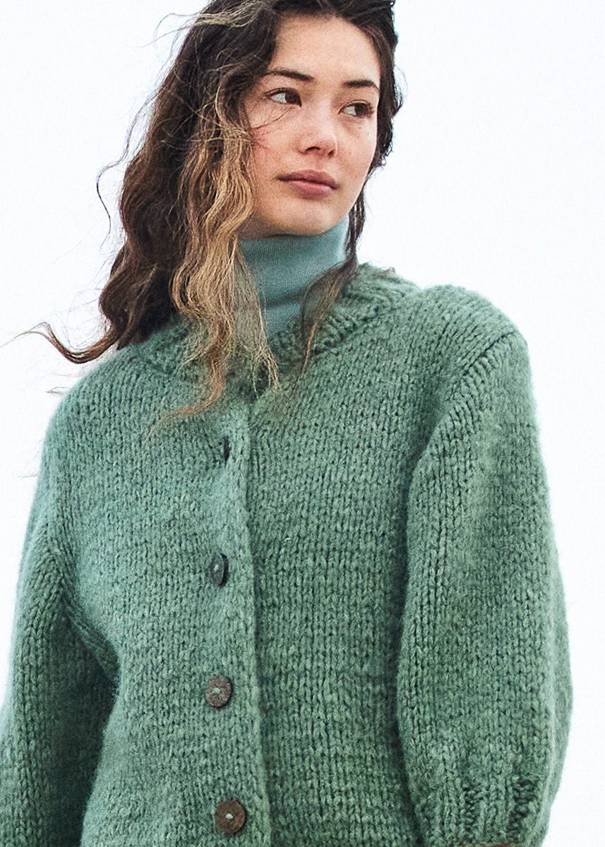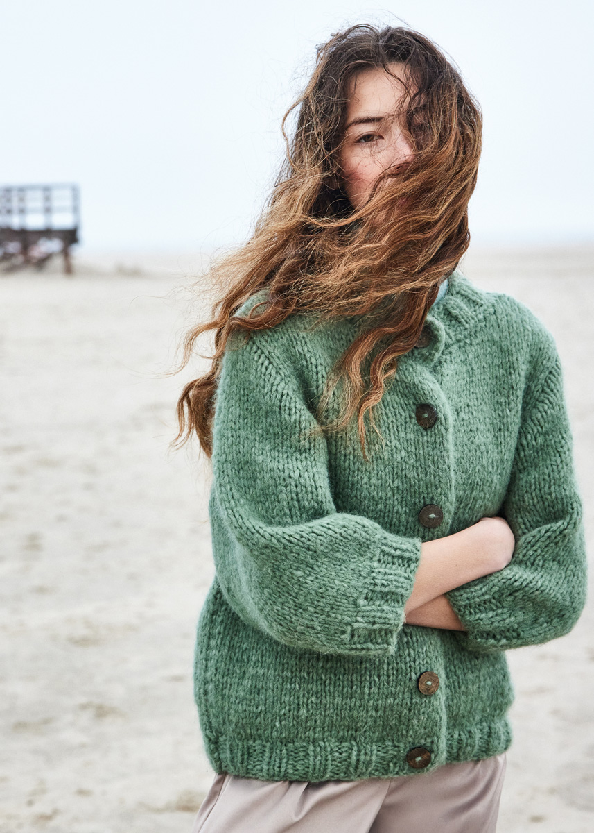 Lana Grossa-Qualität „Alpaca Moda“ (74 % (Baby) Alpaka, 13 % Schurwolle (Merino), 13 % Polyamid, LL = ca 135 m/50 g): ca 400 (450 - 500) g Graugrün (Fb 6); Stricknadeln Nr 8 und 10. 1 Häkelnadel Nr 8; 6 Knöpfe in Braun, 22 mm Durchmesser.