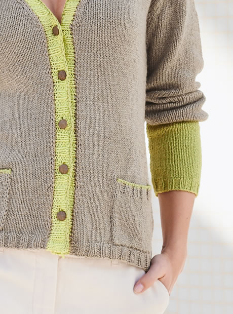 Lana Grossa - Qualität „Linarte“ (40% Viskose, 30% Baumwolle, 20% Leinen, 10% Polyamid, LL = 125 m/50 g), ca. 450 (500 – 550) g Khaki (Fb 65) und je ca. 50 g Pistazie (Fb 26) und Gelbgrün (Fb 43), Stricknadeln Nr. 3,5 und 4, sowie 5 Knöpfe von UNION KNOPF, Art. 451 873, Fb 34, Gr. 15 mm.