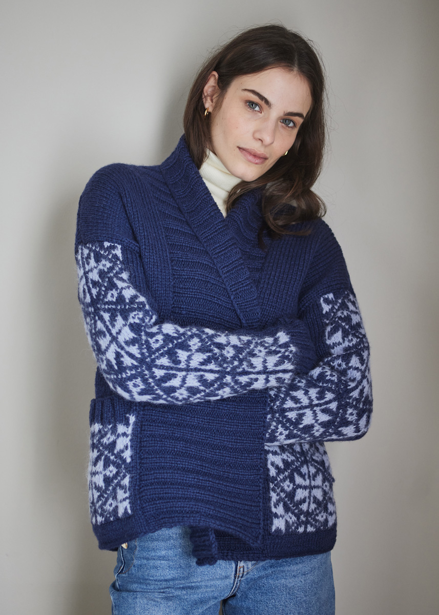 Lana Grossa-Qualität „Setasuri Big“ (70 % Alpaka (Suri), 20 % Seide, 10 % Schurwolle (Merino), LL = ca 100 m/25 g): ca 50 g Veilchenblau (Fb 511); und „Cool Merino Big“ (90 % Schurwolle (Merino), 10 % Polyamid, LL = ca 90 m/50 g): ca 700 (750 - 800 - 850) g Marine (Fb 206); Stricknadeln Nr 5 und 6.