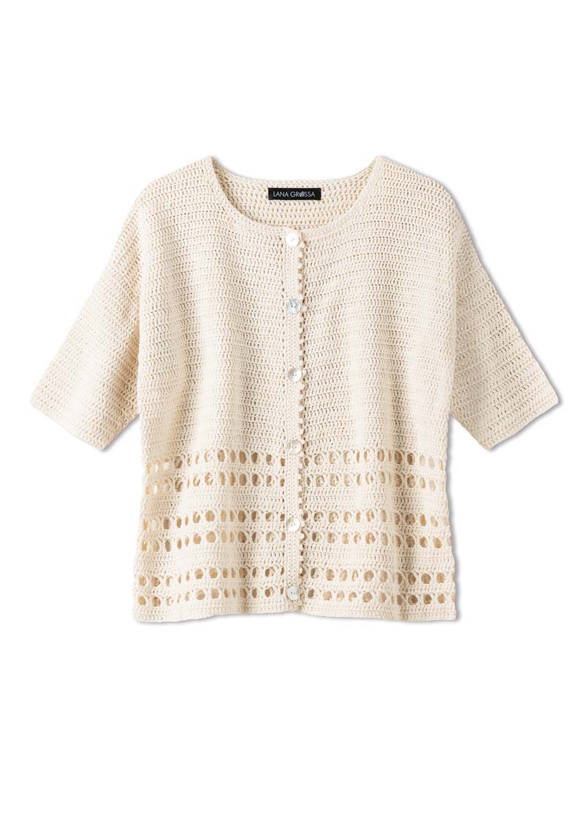 Lana Grossa-Qualität „Summer Cashmere” (90 % Baumwolle, 10 % Kaschmir, LL = ca. 210 m/50 g): ca. 300 (350 – 400) g Creme (Fb. 2); 1 Wollhäkelnadel Nr. 3,5; 6 Perlmuttknöpfe in Natur, ø 18 mm.