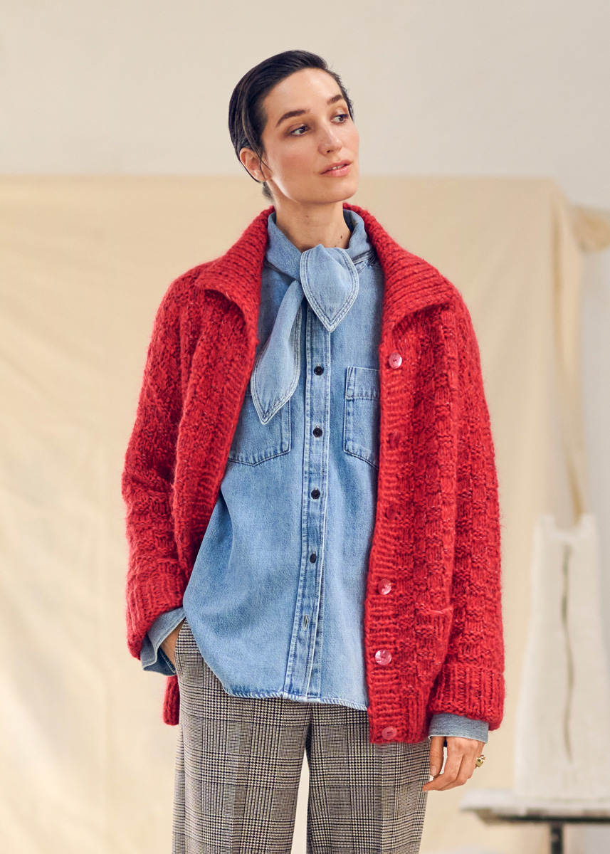 Garn von Lana Grossa, Qualität „Brigitte Silkdream“ (60 % Schurwolle (Merino fine), 30 % Seide, 10 % Mohair (Superkid), Lauflänge 270 m/50 g): 200 (200/200/250) g in Bordeaux Nr. 9. Qualität „Brigitte No. 2“ (47 % Alpaka (Baby), 45 % Baumwolle, 8 % Schurwolle (Merino), Lauflänge 140 m/ 50 g): 300 (350/350/400) g in Leuchtendrot Nr. 74. Qualität „Brigitte No. 3“ (57 % Schurwolle, 20 % Mohair, 23 % Polyamid, Lauflänge 100 m/ JACKE MIT TASCHEN GRÖSSE S (M / L / XL) Wollpaket ab 164,30 Euro 13 43 25 g): 200 (225/225/250) g in Rot Nr. 4. Stricknadeln 6 und 7 (wenn Sie locker stricken) oder 7 und 8 (wenn Sie fest stricken) – wichtig ist, dass Sie auf die Angaben in der Maschenprobe kommen.