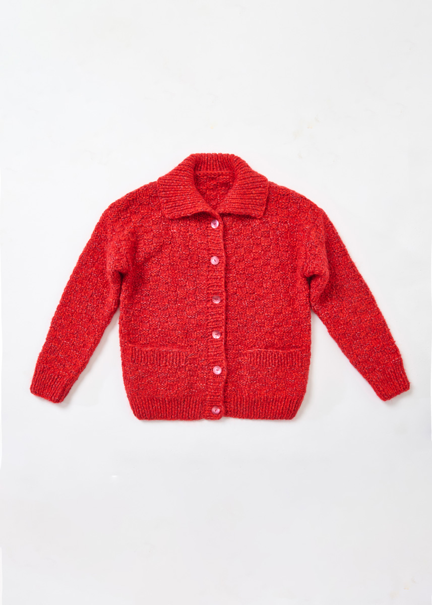 1 kurze Rundstricknadel 6(wenn Sie locker stricken) oder 7 (wenn Sie fest stricken). 6 Knöpfe in Rot Nr. 48, 23 mm Durchmesser, Artikel-Nr. 46286 von Union Knopf.