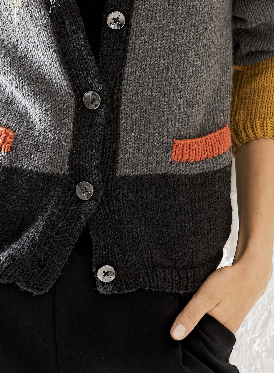 Lana Grossa-Qualität „Cool Wool Big" 100 % Schurwolle (Merino extrafine, filzfrei), LL = ca. 120 m/50 g): ca. 400 (450 – 500) g Dunkelgrau meliert (Fb. 617), ca. 100 (100 – 150) g Anthrazit (Fb. 618) und je ca. 50 g Orange (Fb. 922) und Senfgelb (Fb. 903); Stricknadeln Nr. 3,5 und 4, 1 Rundstricknadel Nr. 3,5, 60 cm lang; 5 Knöpfe von Union Knopf, Art. 450635, 20 mm Ø, Fb. 835 altsilber.