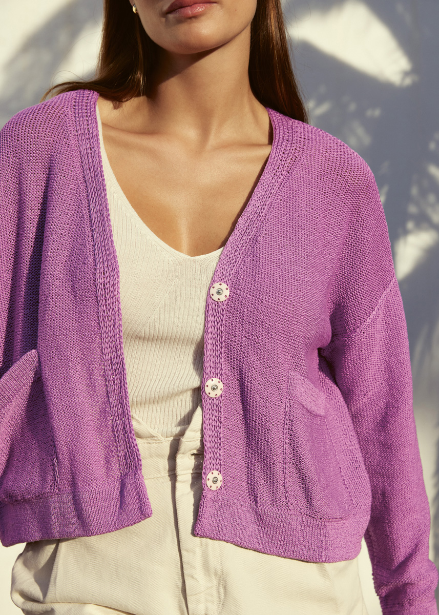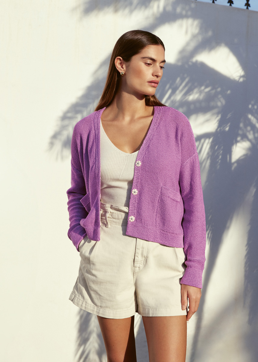 Ein beliebter Klassiker, der im Heute angekommen ist: Zum schlichten Grundmuster – glatt links statt rechts gestrickt – bildet die Verschlussblende aus Hebemaschen einen modernen Kontrast. Konturiert aufgesetzte Taschen und extra große Druckknöpfe sind nicht nur praktisch, sondern weitere Details eines runderneuerten Looks.