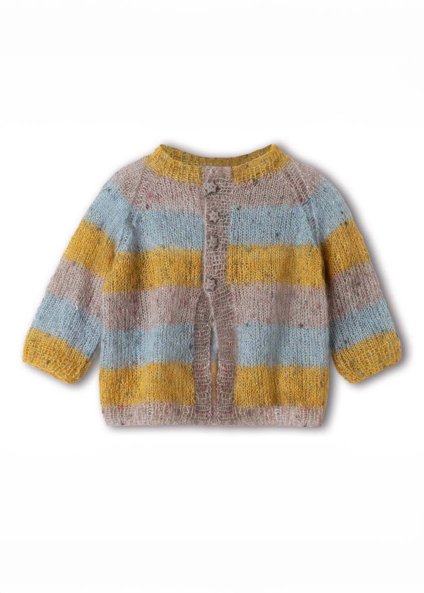 Lana Grossa Natural Superkid Tweed (60% Mohair (Superkid), 30% Seide, 7% Baumwolle, 3% Polyester; LL = 200 m/25 g): je 25 (25/25/25) g Senfgelb (Fb. 615), Hellblau (Fb. 618) und Hellgrau (Fb. 623); eine Rundstricknadel 4 mm; Maschenmarkierer; 4 Sternchenknöpfe mit 12 mm Ø.