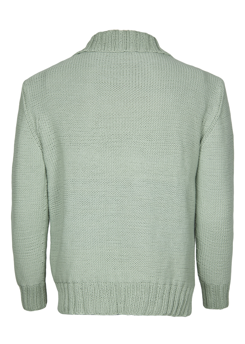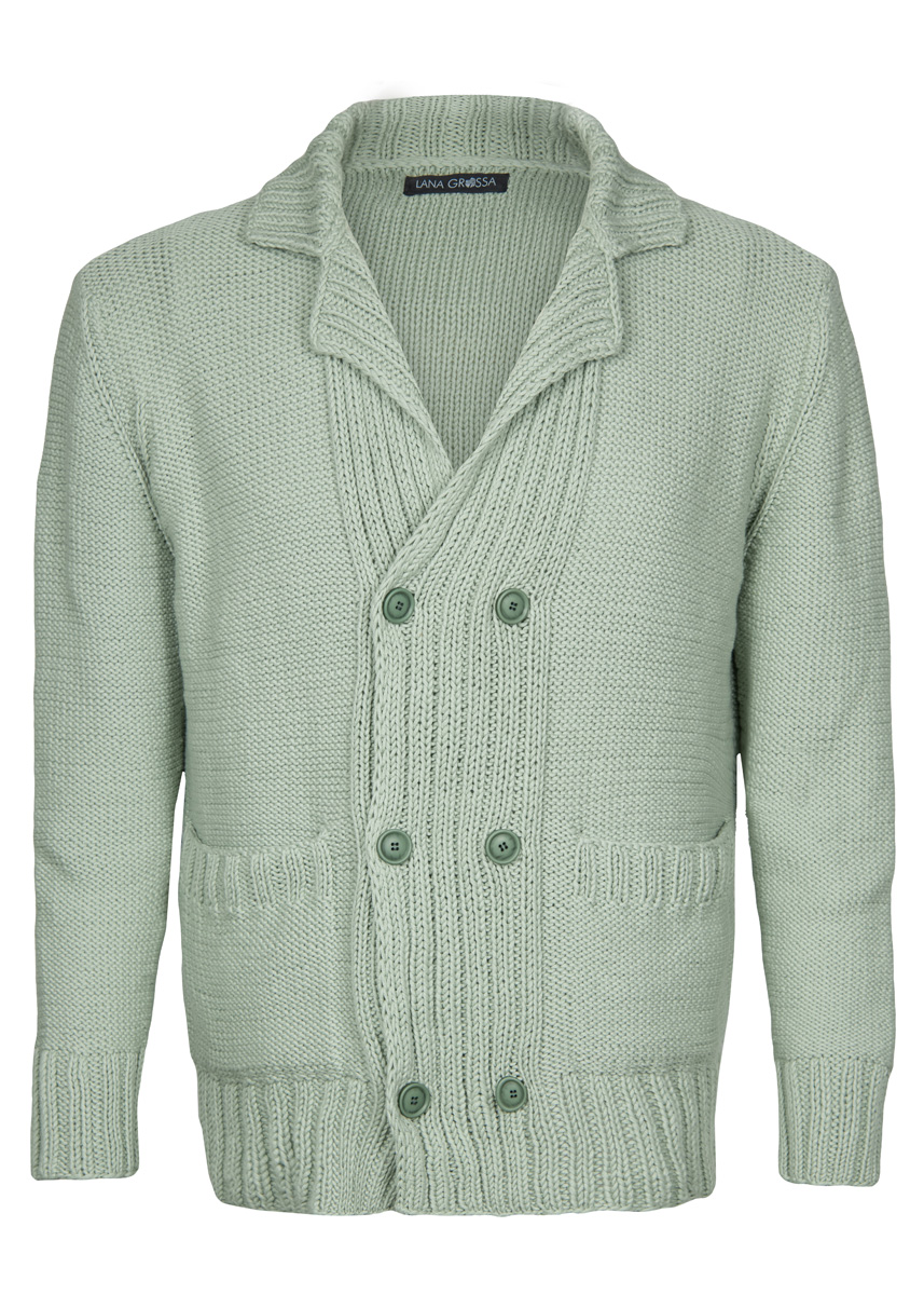 Lana Grossa Organico (100% Bio Baumwolle, Lauflänge 90 m/50 g), 750 (800 – 850) g Graugrün (Fb 89); Stricknadeln Nr. 4, 1 Rundstricknadel Nr. 4, 40 cm lang, 6 Knöpfe von UNION KNOPF, Art. 13003, Fb Graugrün, Gr. 25 mm.