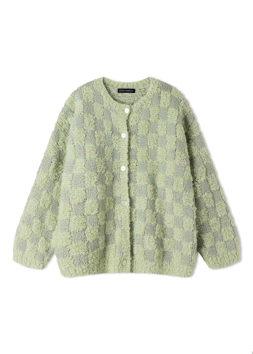 Lana Grossa Orsetto (60% Schurwolle (Merino), 40% Alpaka (superfein), Lauflänge 75 m/50 g), 400 g in Weißgrün (Fb 10) und Lana Grossa Lucida (58% Schurwolle (Merino), 42% Viskose, Lauflänge 100 m/50 g), 250 g in Weißgrün (Fb 19); Stricknadeln Nr 4,5 und Nr 5; 1 Rundstricknadel Nr 4,5, 60 cm lang; 6 hellgrüne Knöpfe, 20 mm Ø.