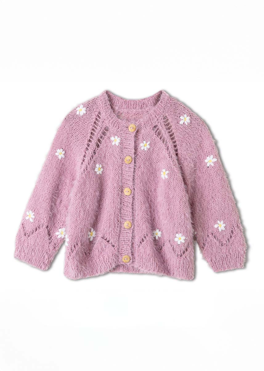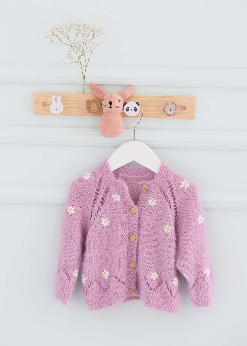Lana Grossa Per Fortuna (74% Baumwolle (Bio), 26% Polyamid; LL = 190 m / 50 g): 100 (100/100/150) g Flieder (Fb. 5) und Ecopuno (72% Baumwolle, 17% Schurwolle (Merino), 11% Alpaka (Baby); LL = 215 m/50 g): je 50 (50/50/50) g Gelb (Fb. 95) und Weiß (Fb. 26); je eine Rundstricknadel 3,5 mm und 4 mm; Maschenmarkierer; 5 Holzknöpfe mit 14 mm Ø.